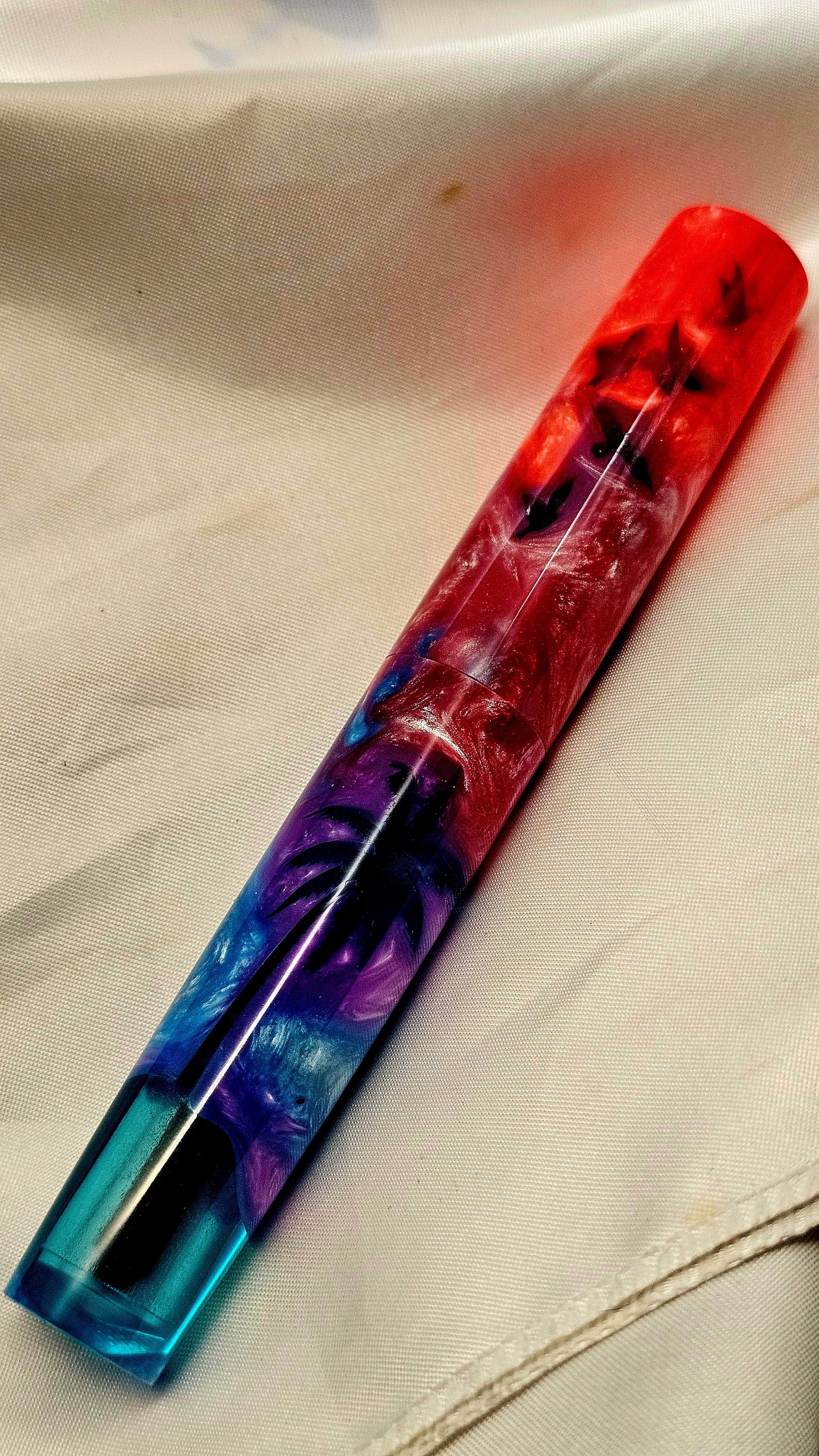 The Scripted Paradise pen is a radiant artifact of storytelling, forged from high-grade resin that transitions in a mesmerizing gradient—from deep oceanic blue at the base, through twilight purples and coral pinks, to a fiery sunset red near the cap. The colors aren’t just layered—they seem to flow, as if the pen itself is a vessel of liquid light.