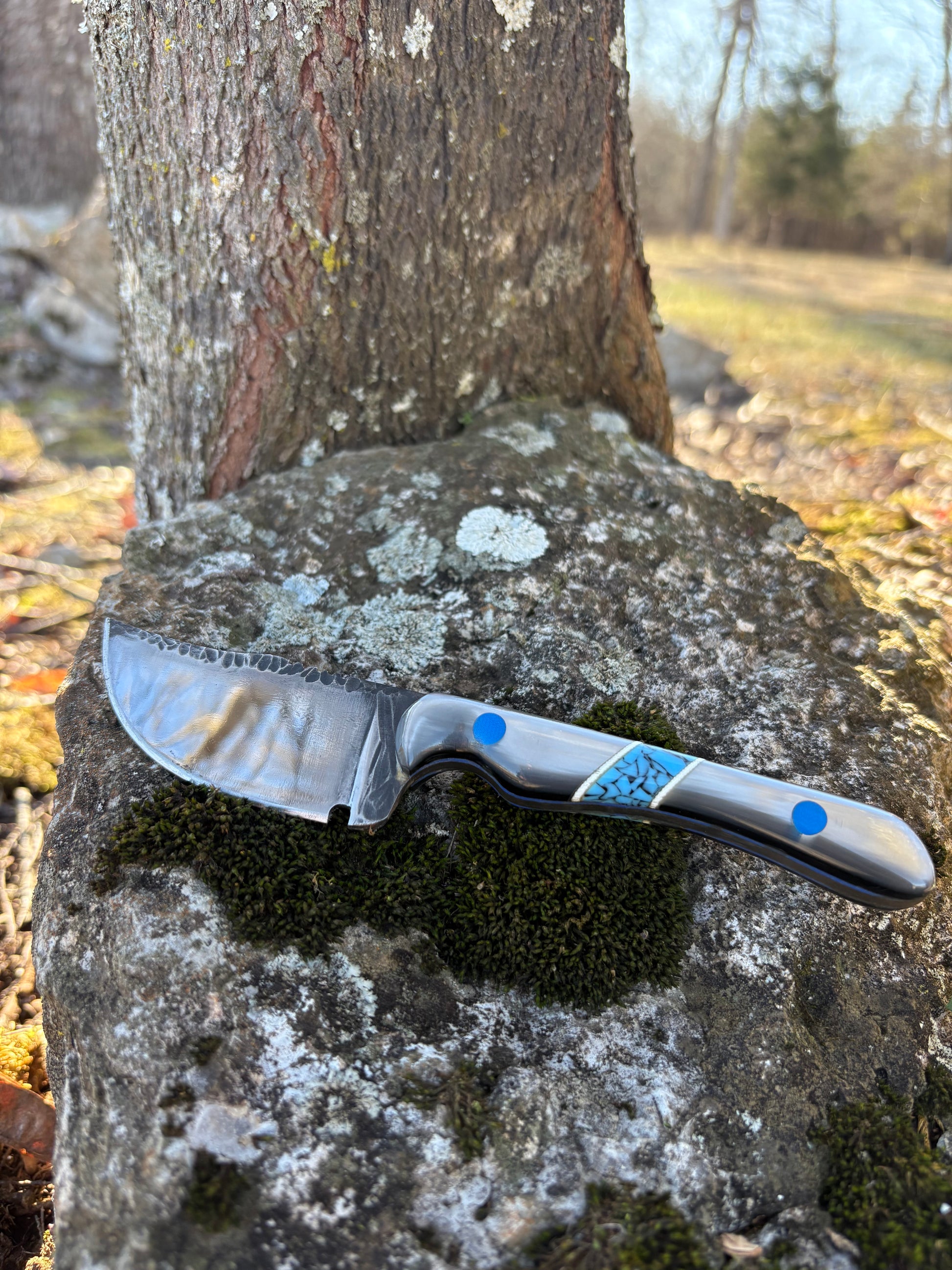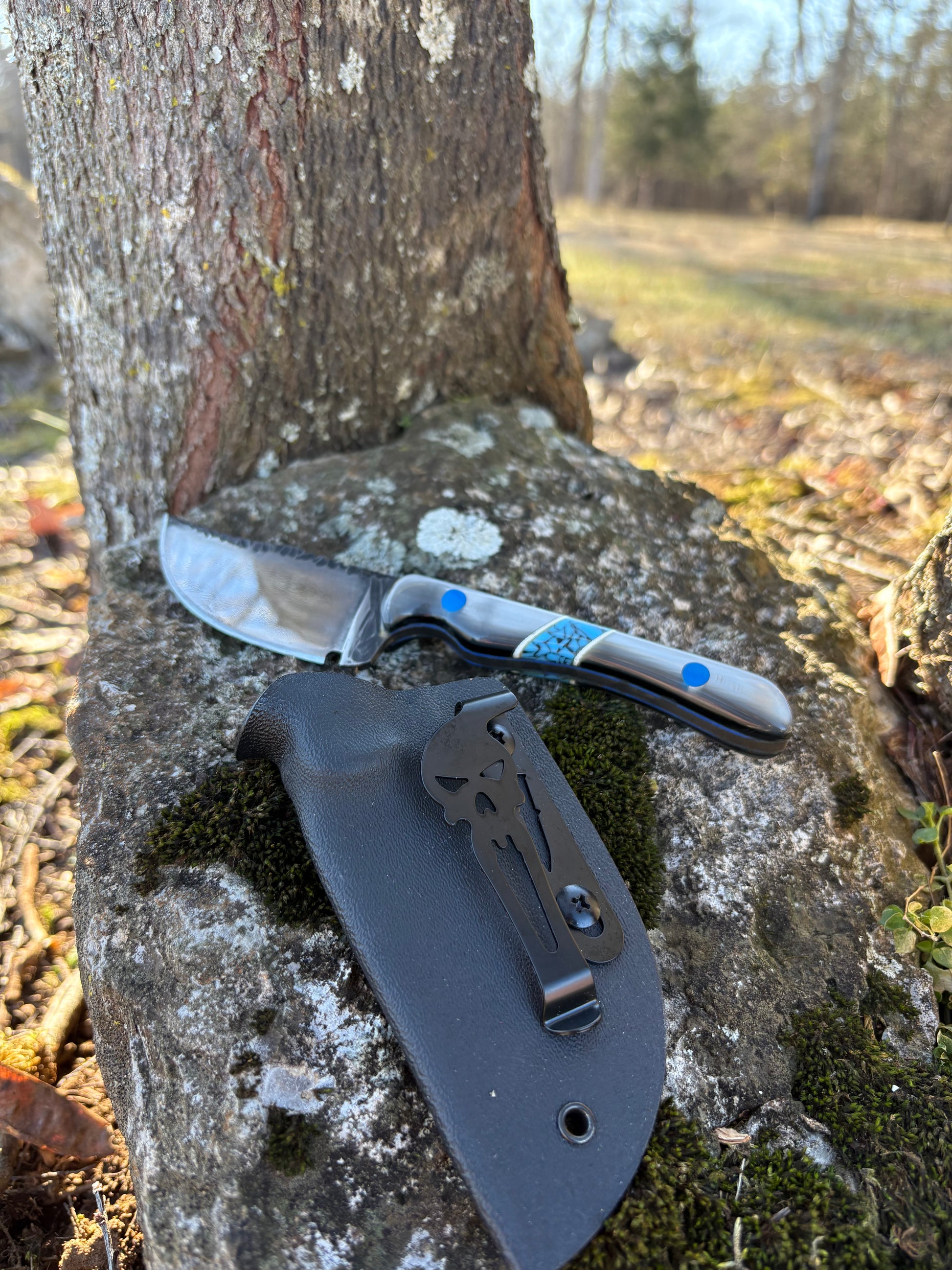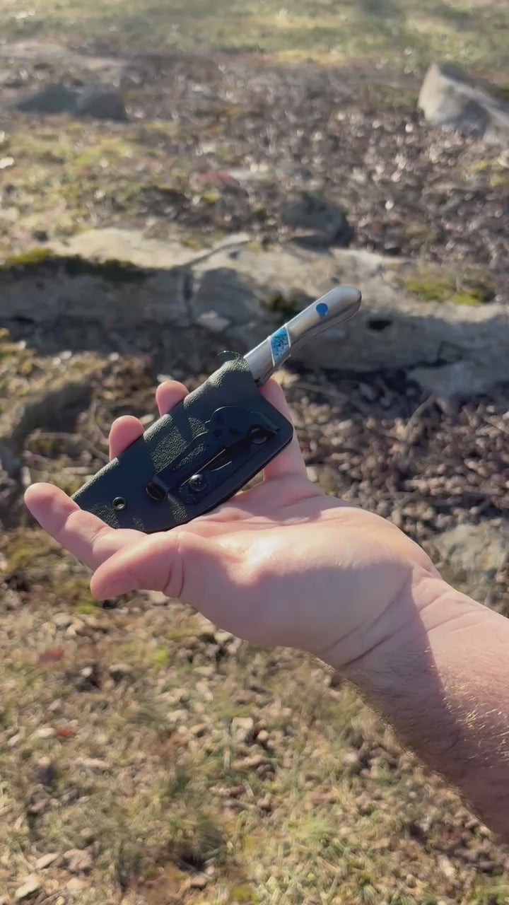 The Silver Tide combines elegance and durability with its silver "oyster" acrylic handles accented by black-webbed blue TruStone inlays. G10 pins and liners provide sleek reinforcement, while the blade—a mirror-finished, rock-textured 1095 high-carbon steel—delivers sharpness and style for any task.