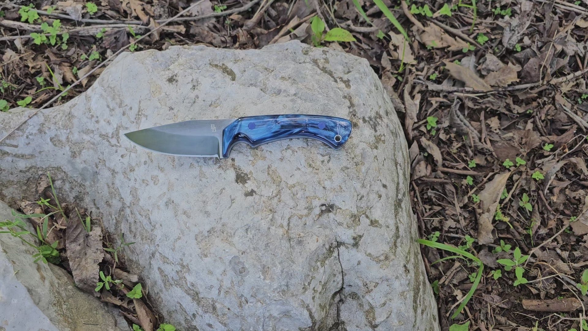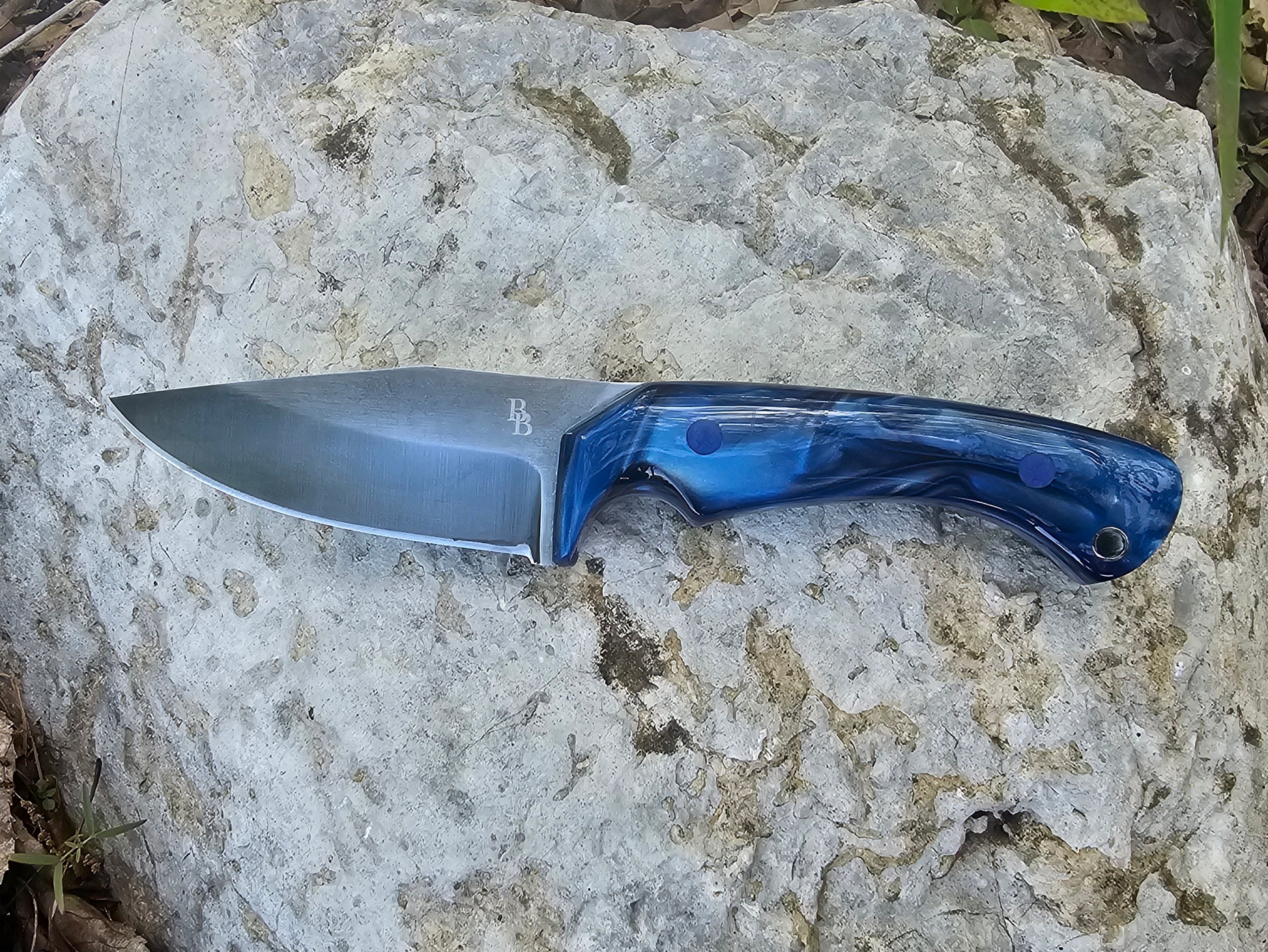 The Blue Vortex is a custom fixed-blade knife that merges functionality with artistic flair. Its standout feature is the handle—crafted from a vibrant, deep blue arcylic with marbled swirls that resemble the flow of ocean currents or a lightning storm frozen in time. The ergonomic contour of the handle ensures a solid grip, with a lanyard hole at the top for easy carry options.