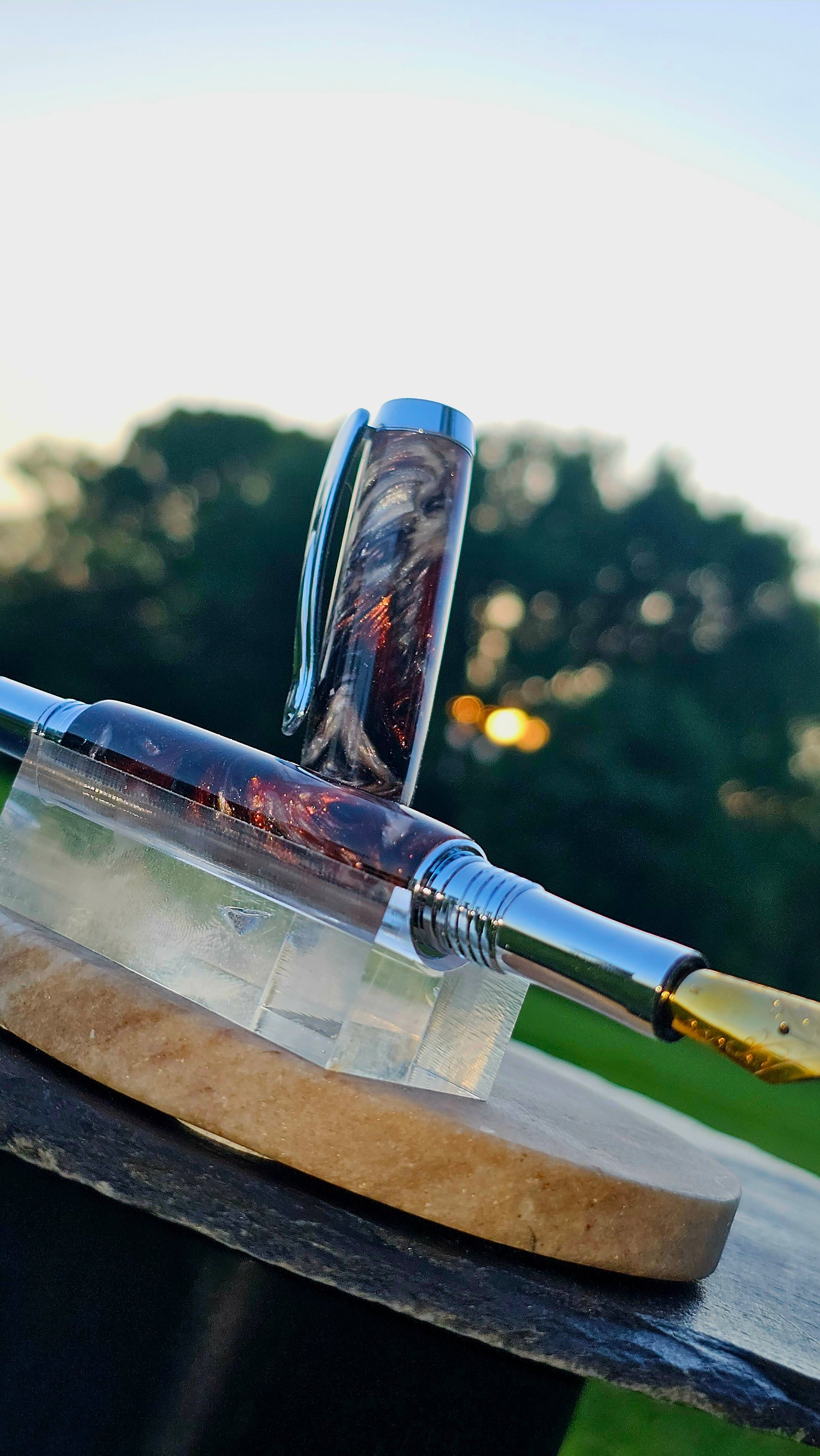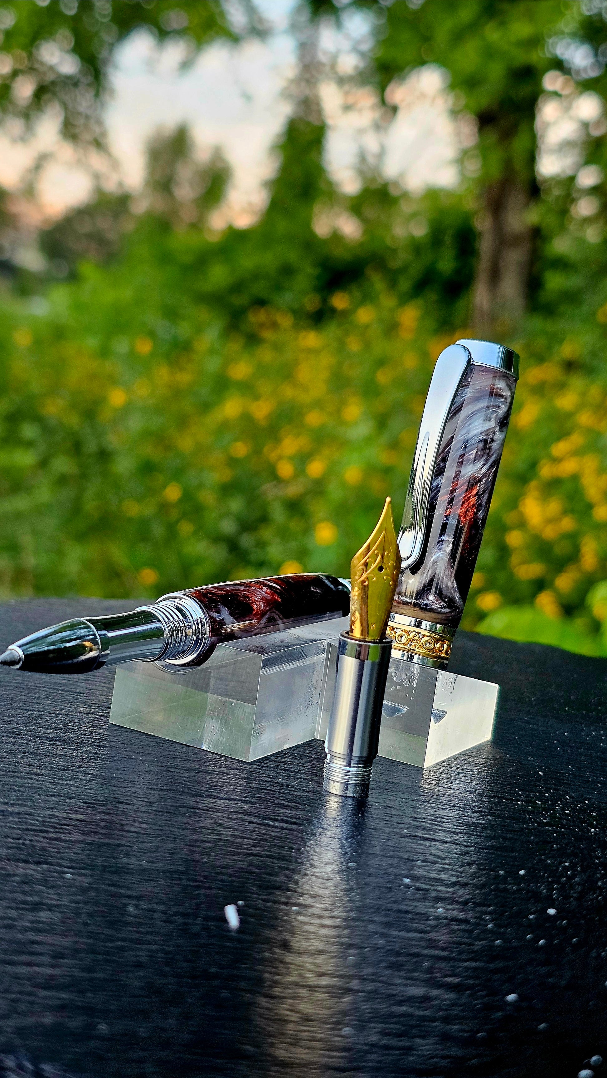 Experience refined writing with this luxury marbled fountain pen, designed for professionals, collectors, and anyone who values style and precision. Its dramatic swirl of deep black and crimson delivers eye-catching sophistication, while gold and silver accents add a touch of executive charm.