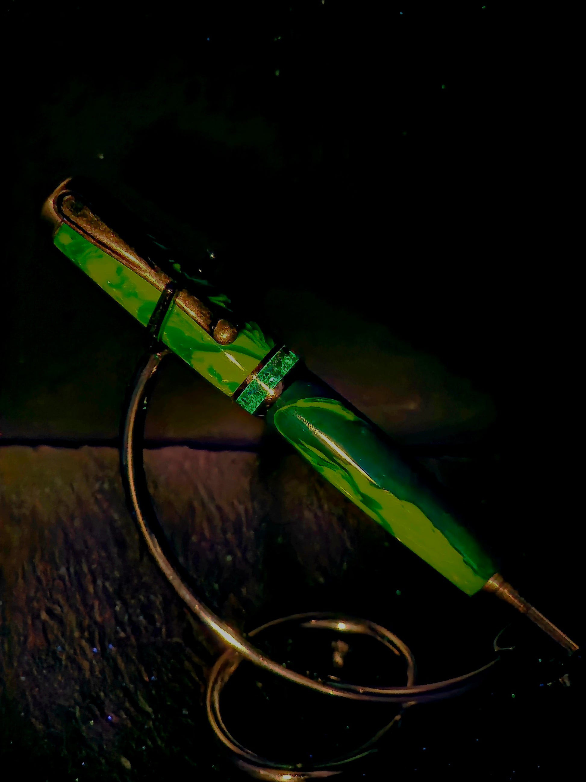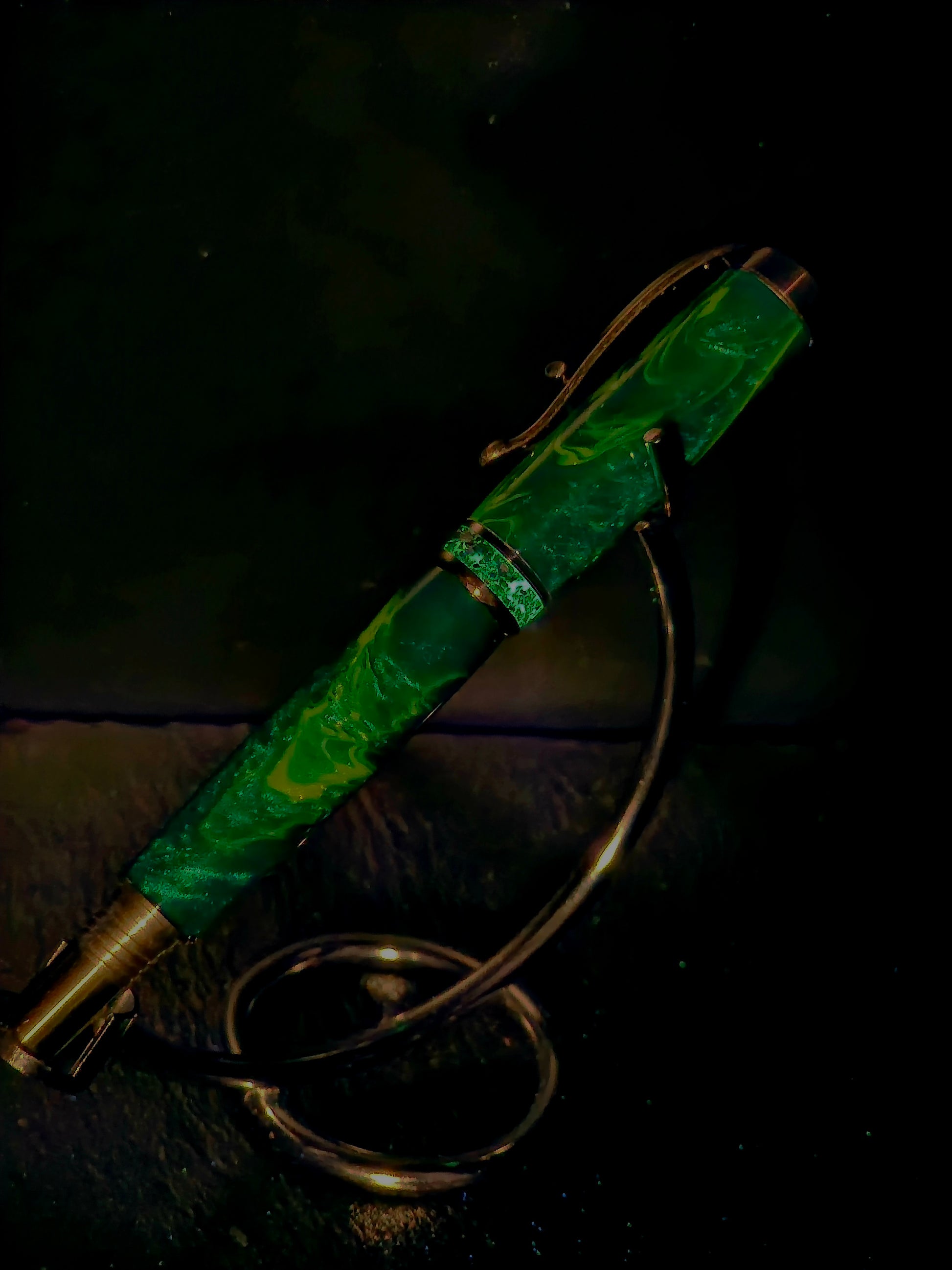 This Custom Handmade Judge Moss Resin Jr Bandit Roller Ball features meticulously crafted collar hardware, enhanced with genuine Black Emerald opals and a subtle green glow powder for a distinctive look. Expertly designed for both durability and aesthetic appeal, it combines unique materials with precision craftsmanship to create a one-of-a-kind accessory that stands out in any collection.
