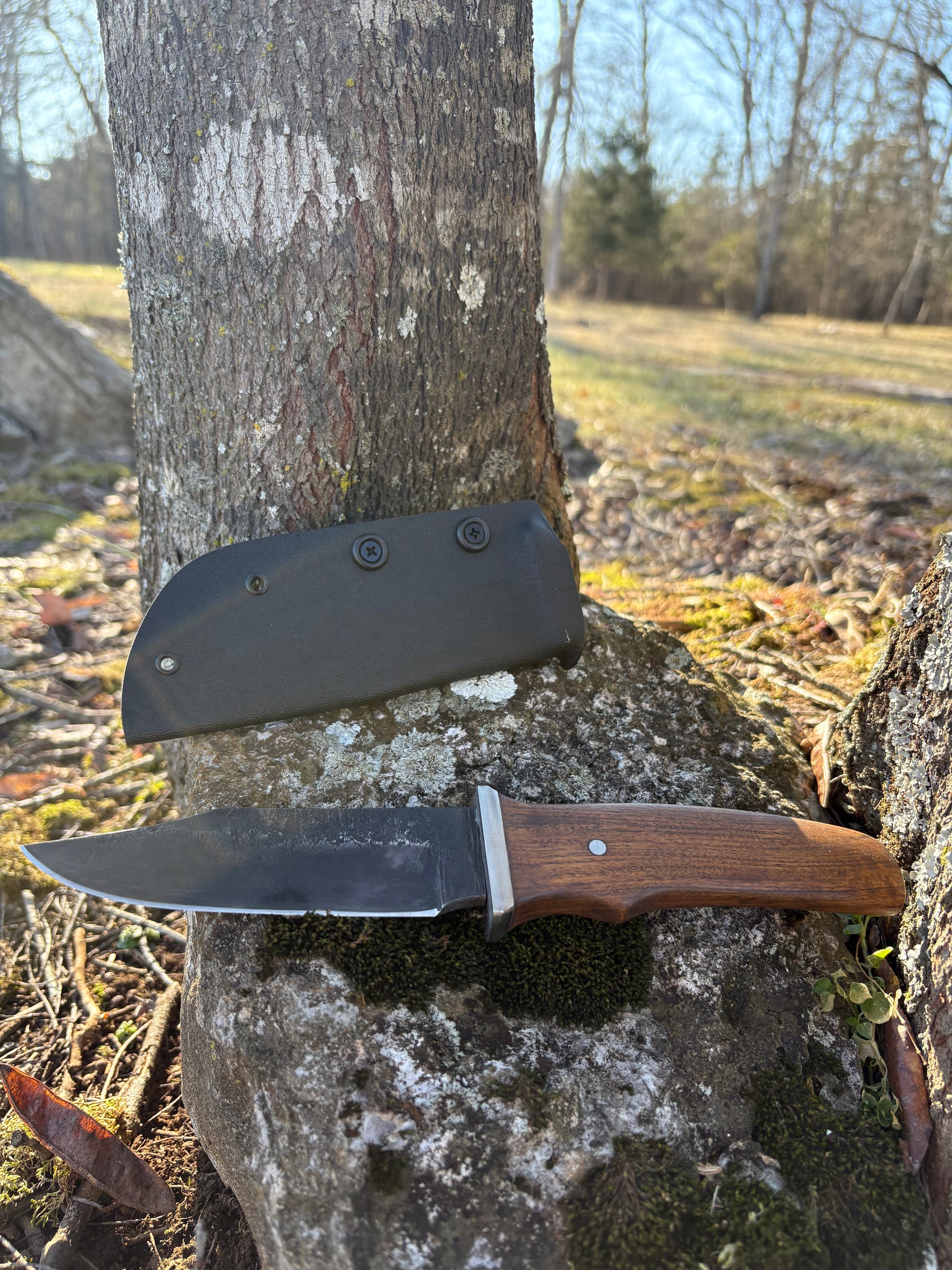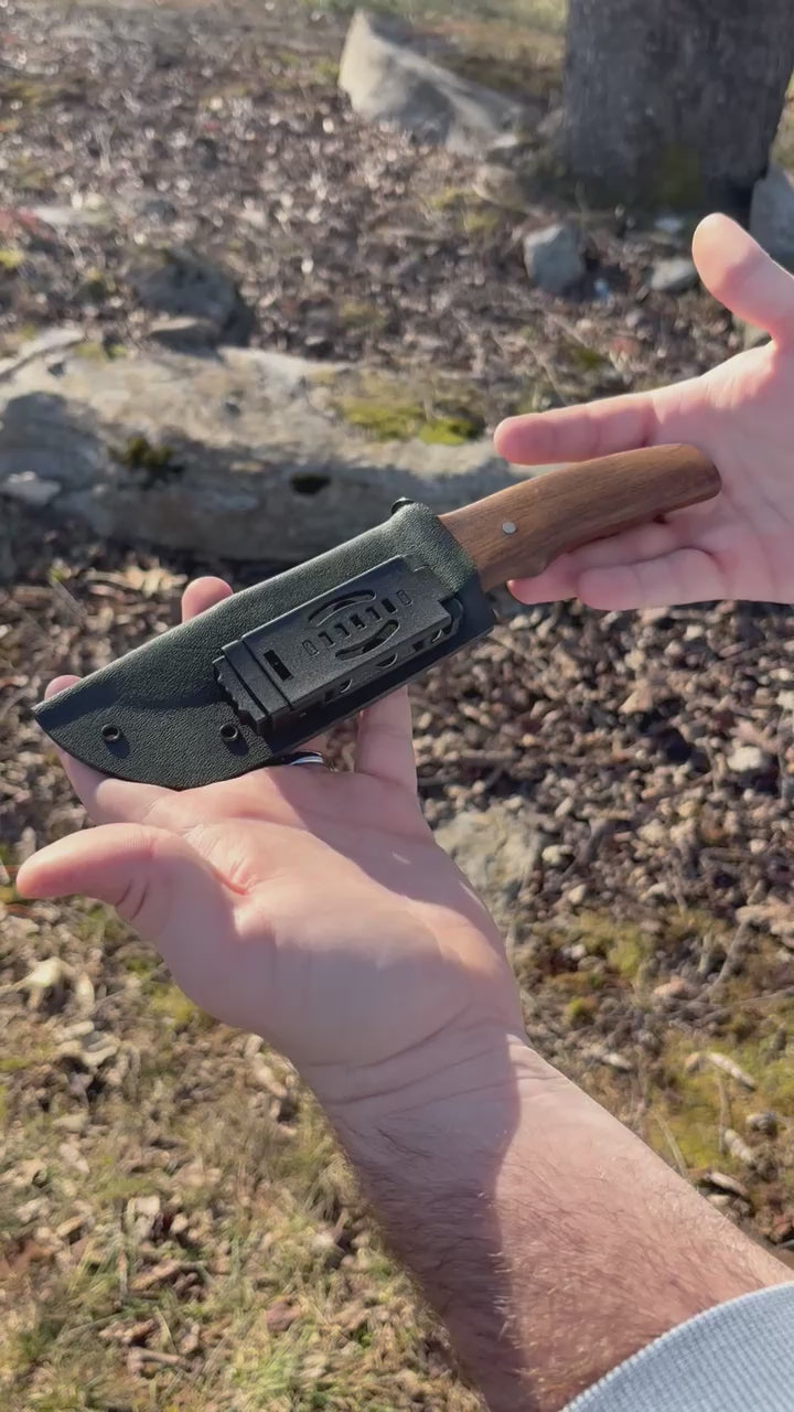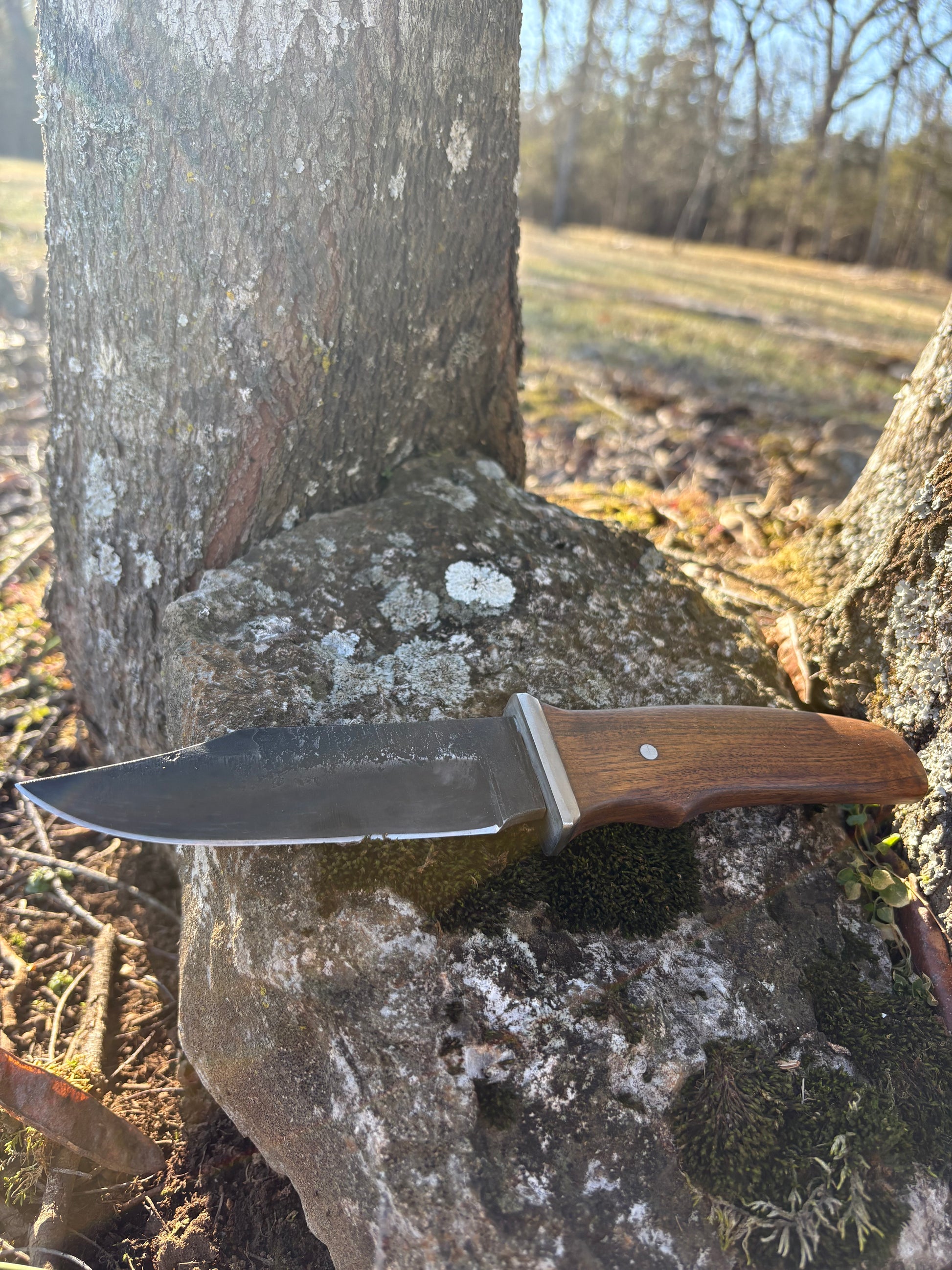 Hand-forged with precision, this hidden tang knife features a robust black 5160 steel blade, complemented by a striking handle crafted from exquisite Mopani wood. Stainless steel bolster and pins provide both elegance and durability, making it a reliable companion for any outdoor adventure or collection.