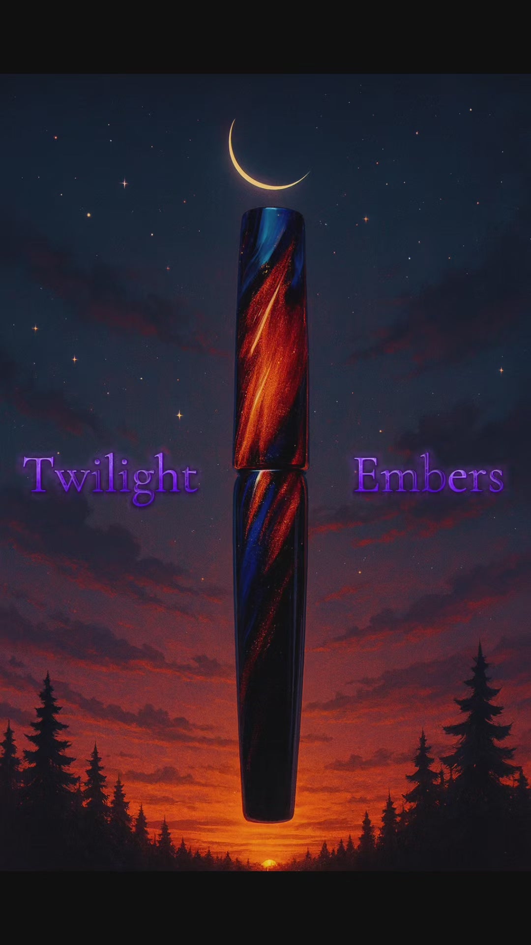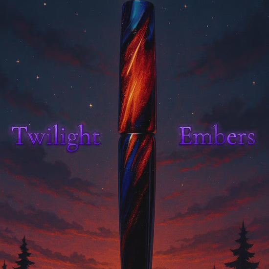 A luminous relic of dusk, this handcrafted fountain pen captures the fleeting magic of twilight. Its marbled body swirls with deep indigo, ember red, and midnight blue—echoing the last light of day as it melts into night.