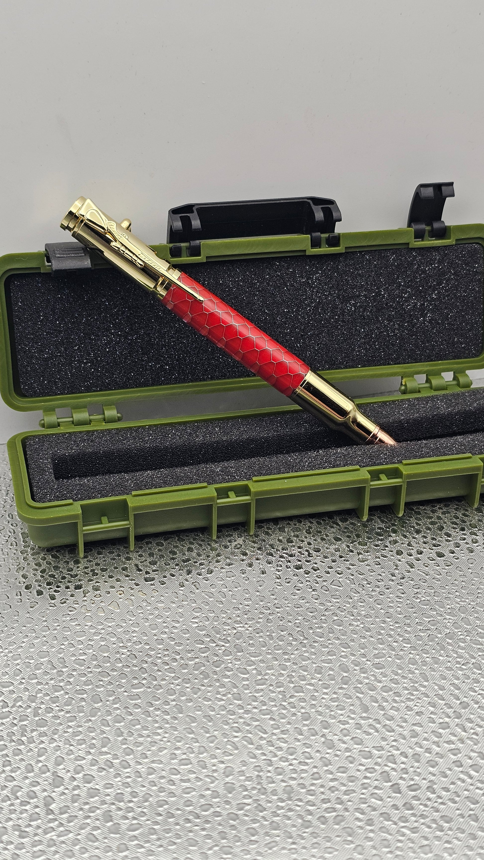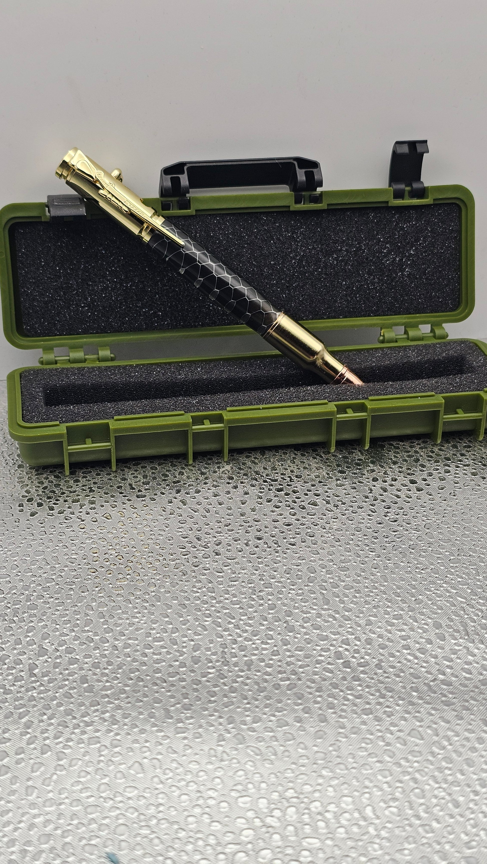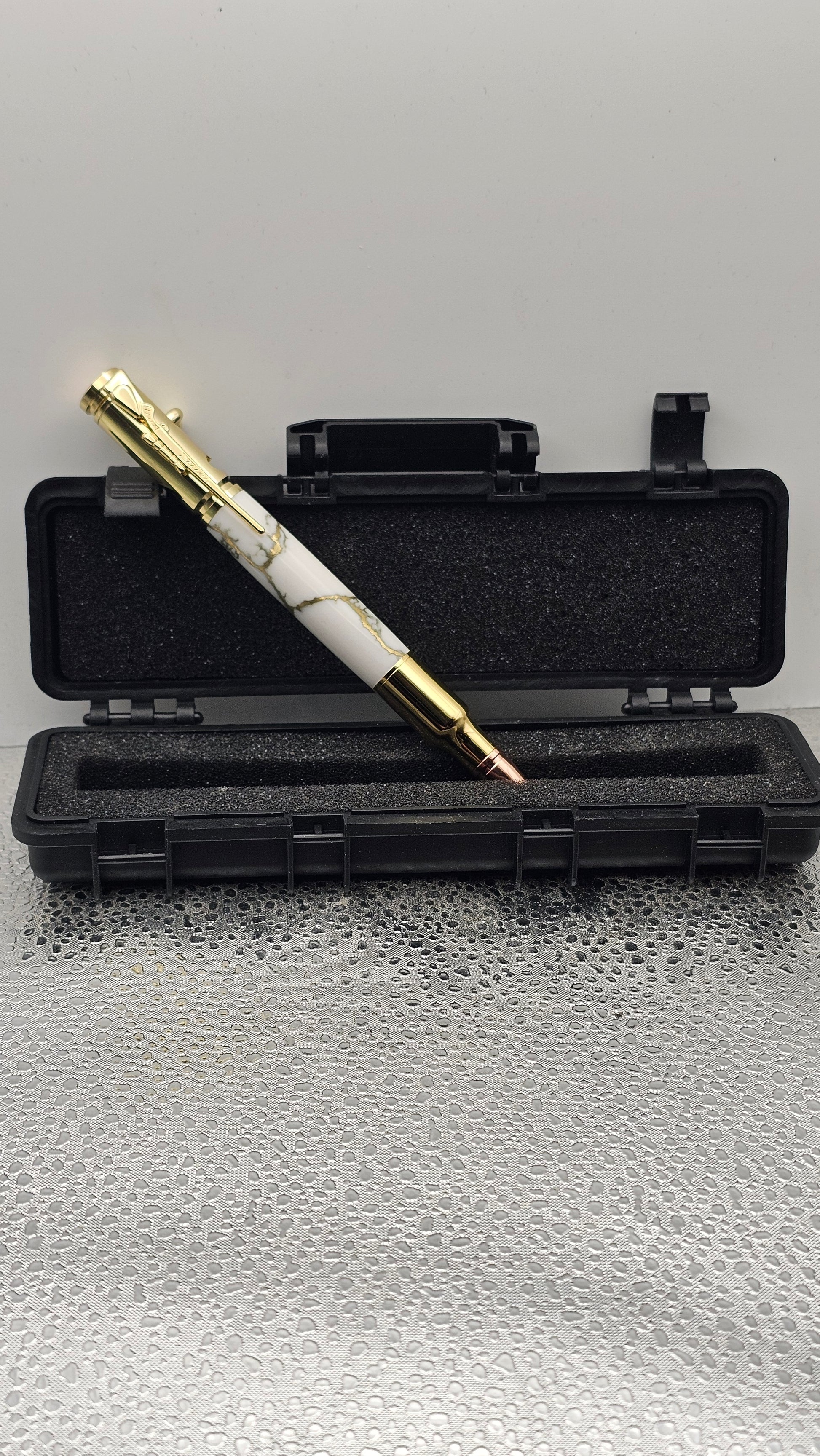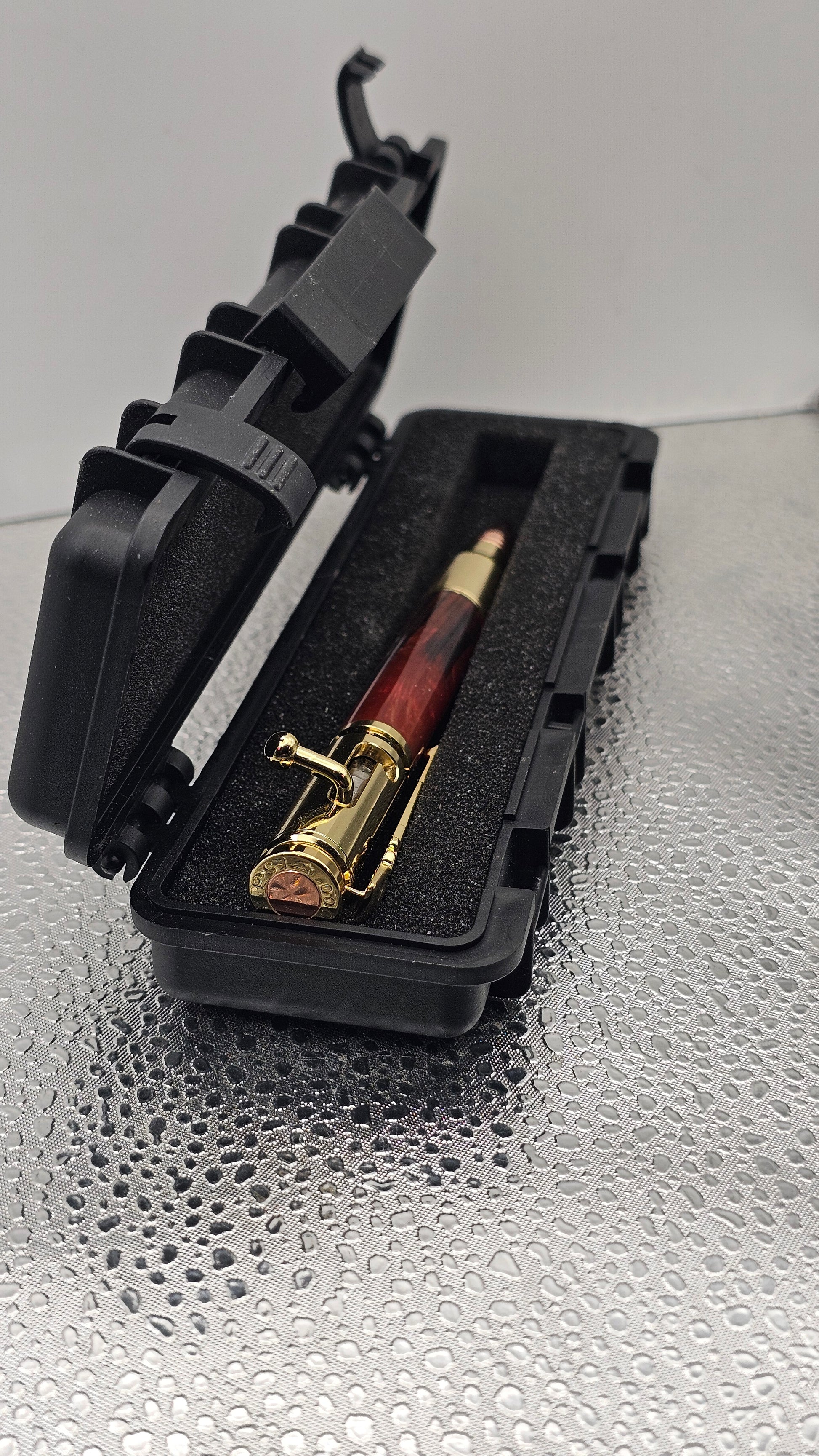 24k Gold 30 Cal Bolt-action hardware, with a hand turned acrylic. The pen comes with its own pen case shaped like a real gun case to compliment the pens style. Some pens have Acrylic, Aluminum Honeycomb, Hybridz, Stabilized Wood, or even Tru Stone.