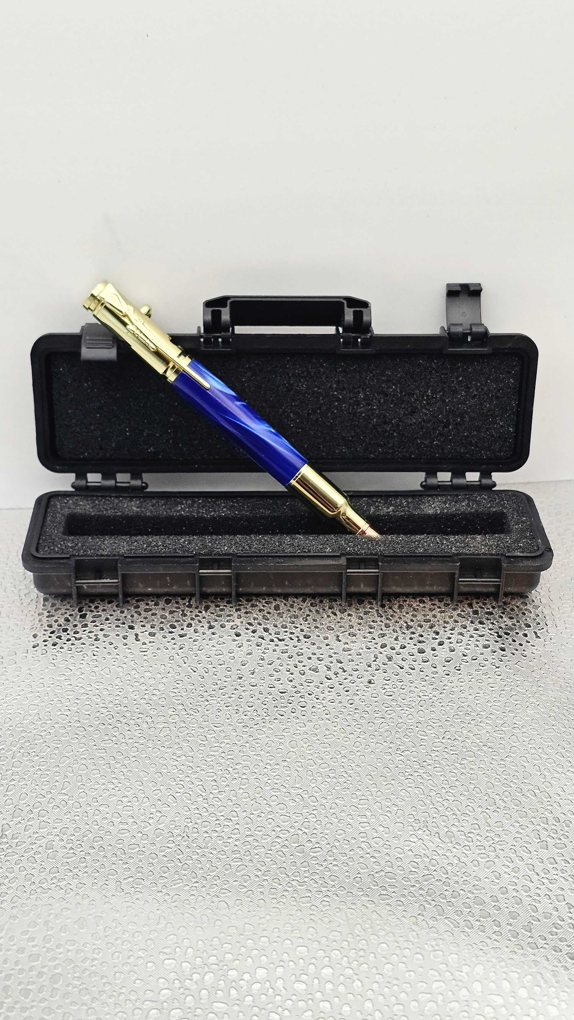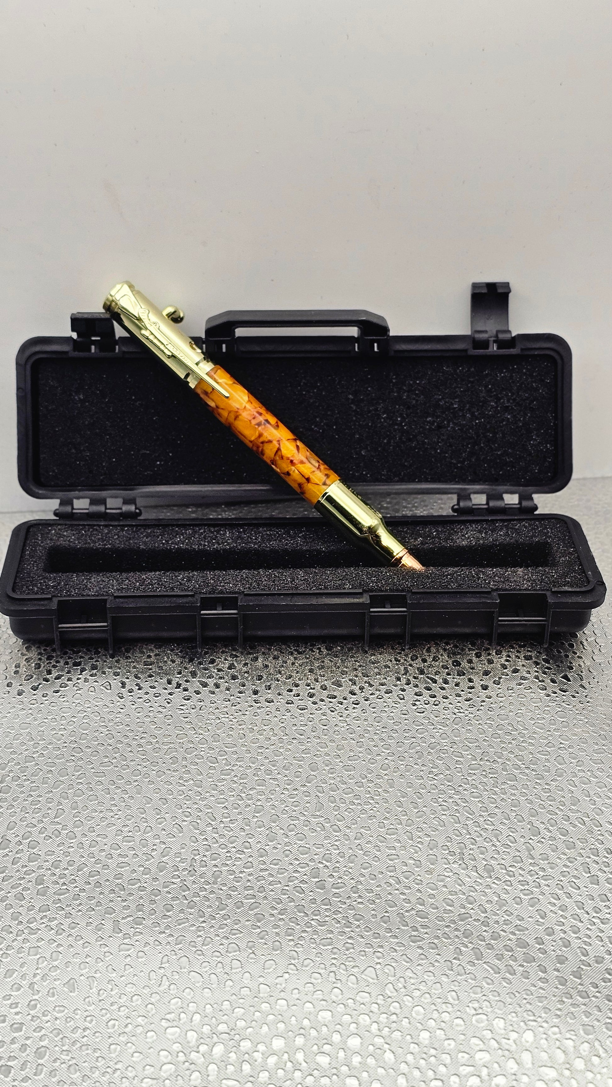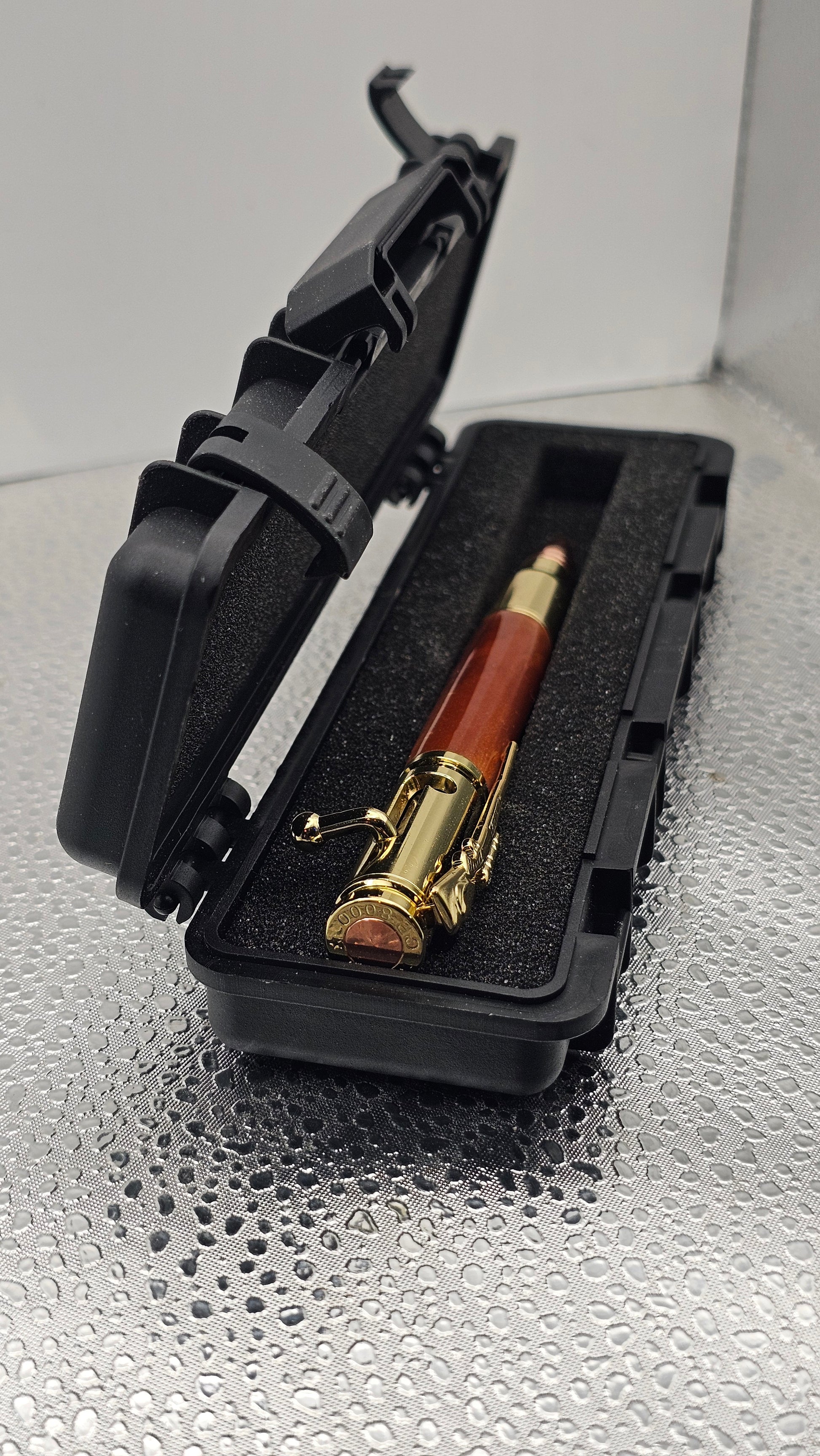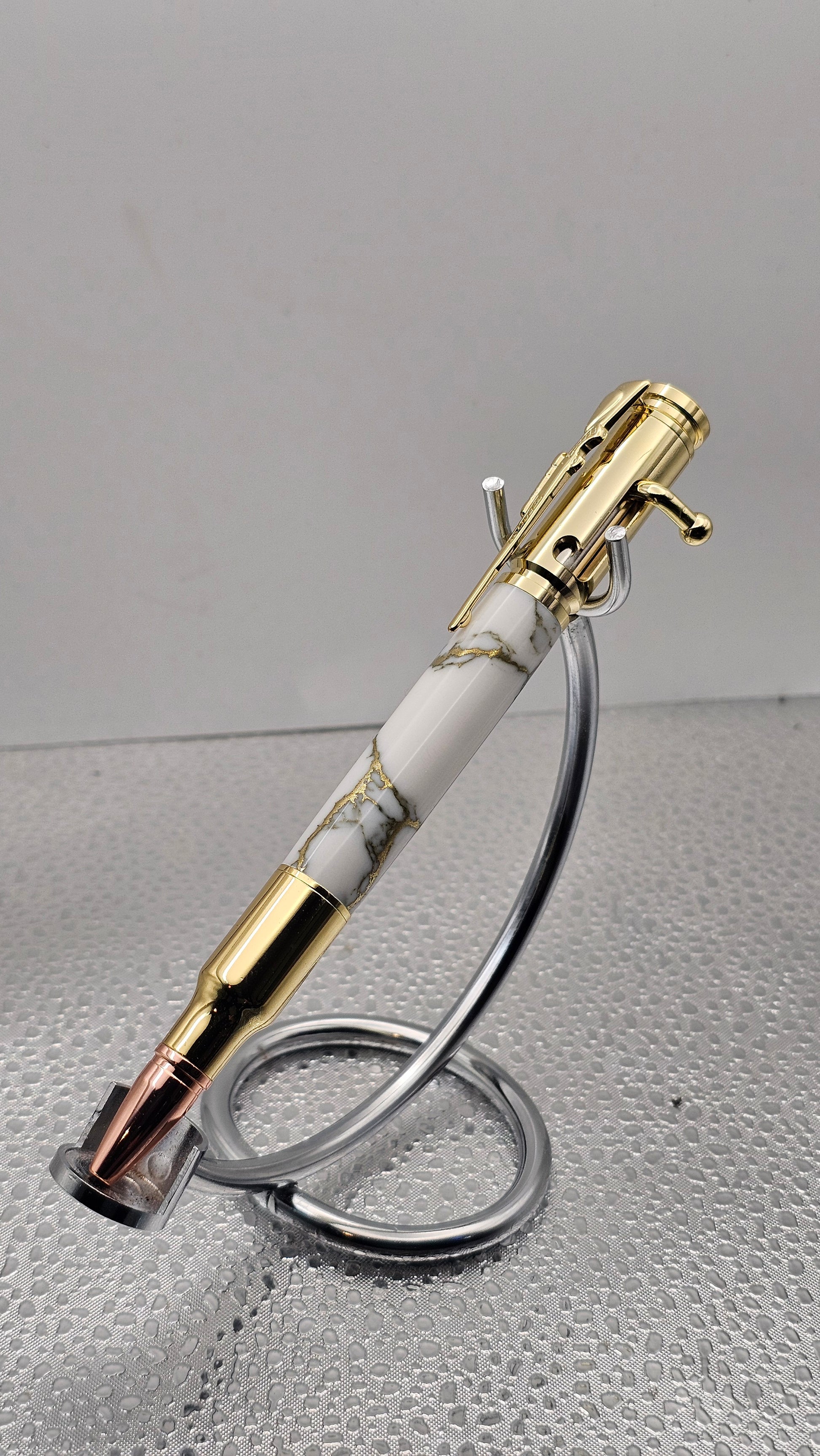 24k Gold 30 Cal Bolt-action hardware, with a hand turned acrylic. The pen comes with its own pen case shaped like a real gun case to compliment the pens style. Some pens have Acrylic, Aluminum Honeycomb, Hybridz, Stabilized Wood, or even Tru Stone.