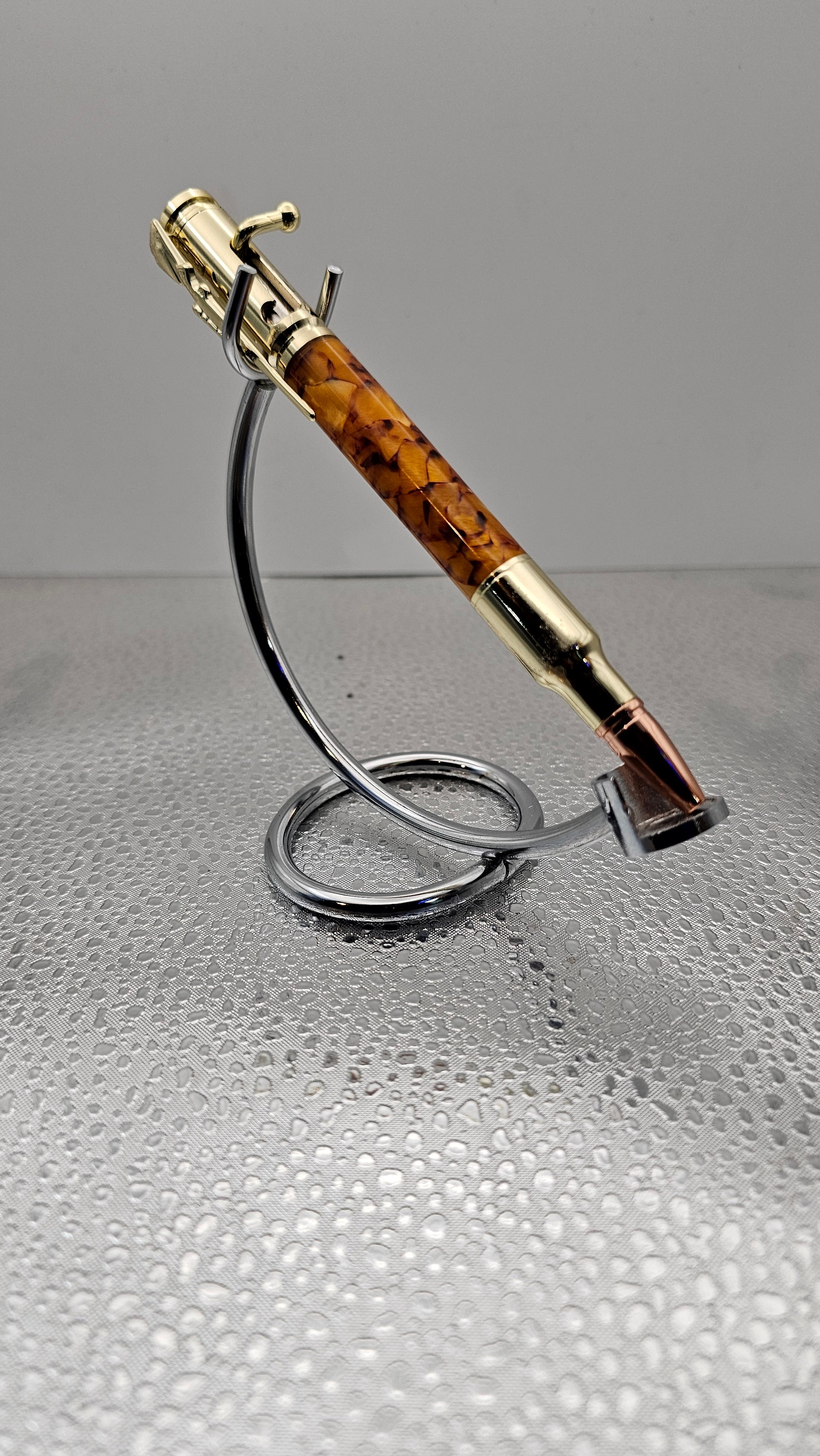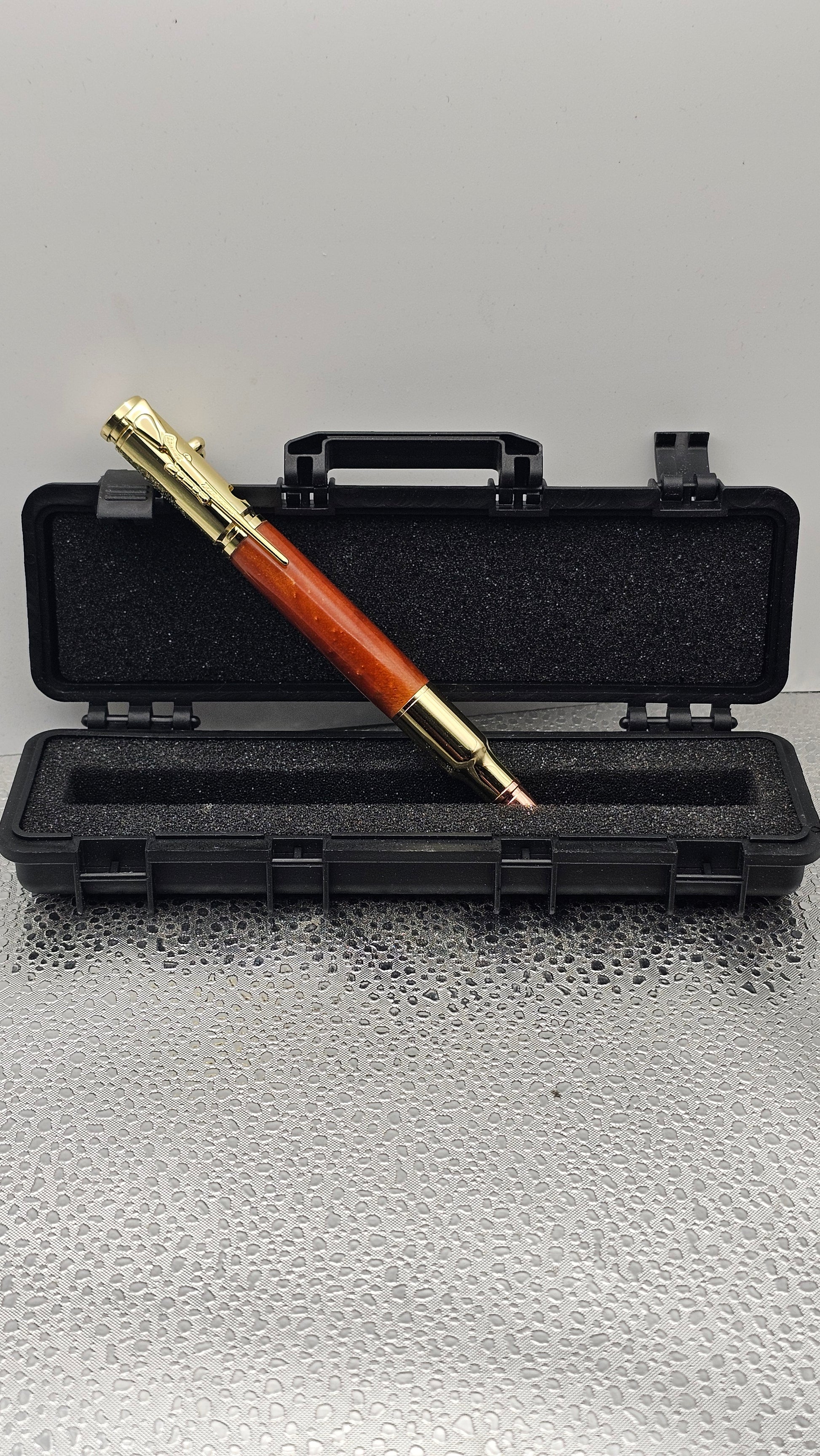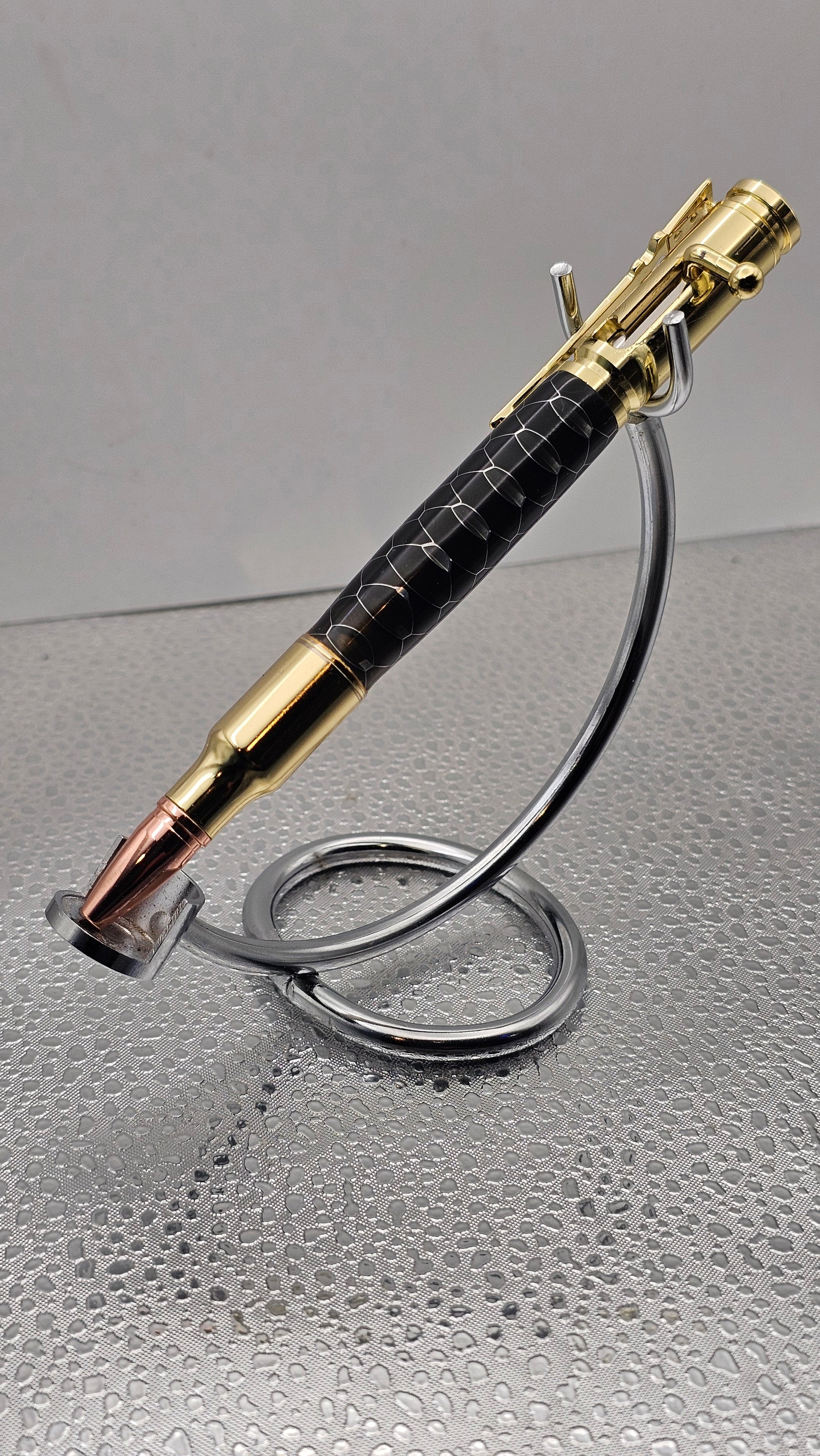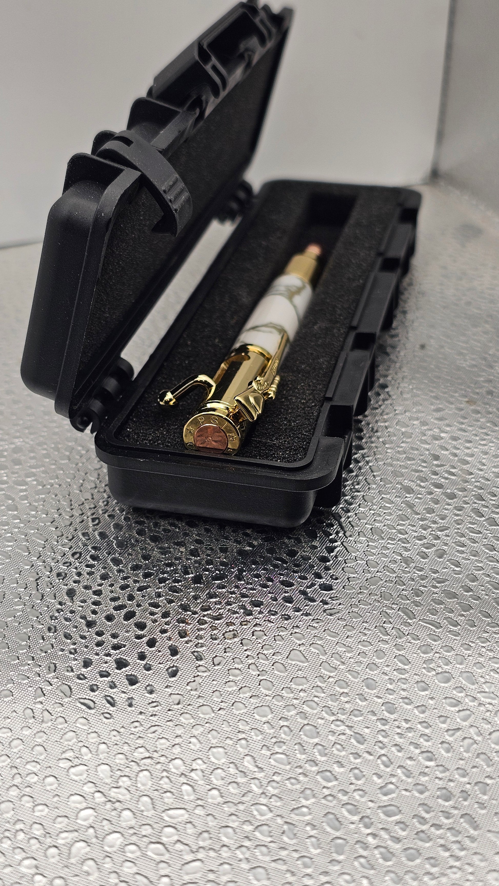 24k Gold 30 Cal Bolt-action hardware, with a hand turned acrylic. The pen comes with its own pen case shaped like a real gun case to compliment the pens style. Some pens have Acrylic, Aluminum Honeycomb, Hybridz, Stabilized Wood, or even Tru Stone.