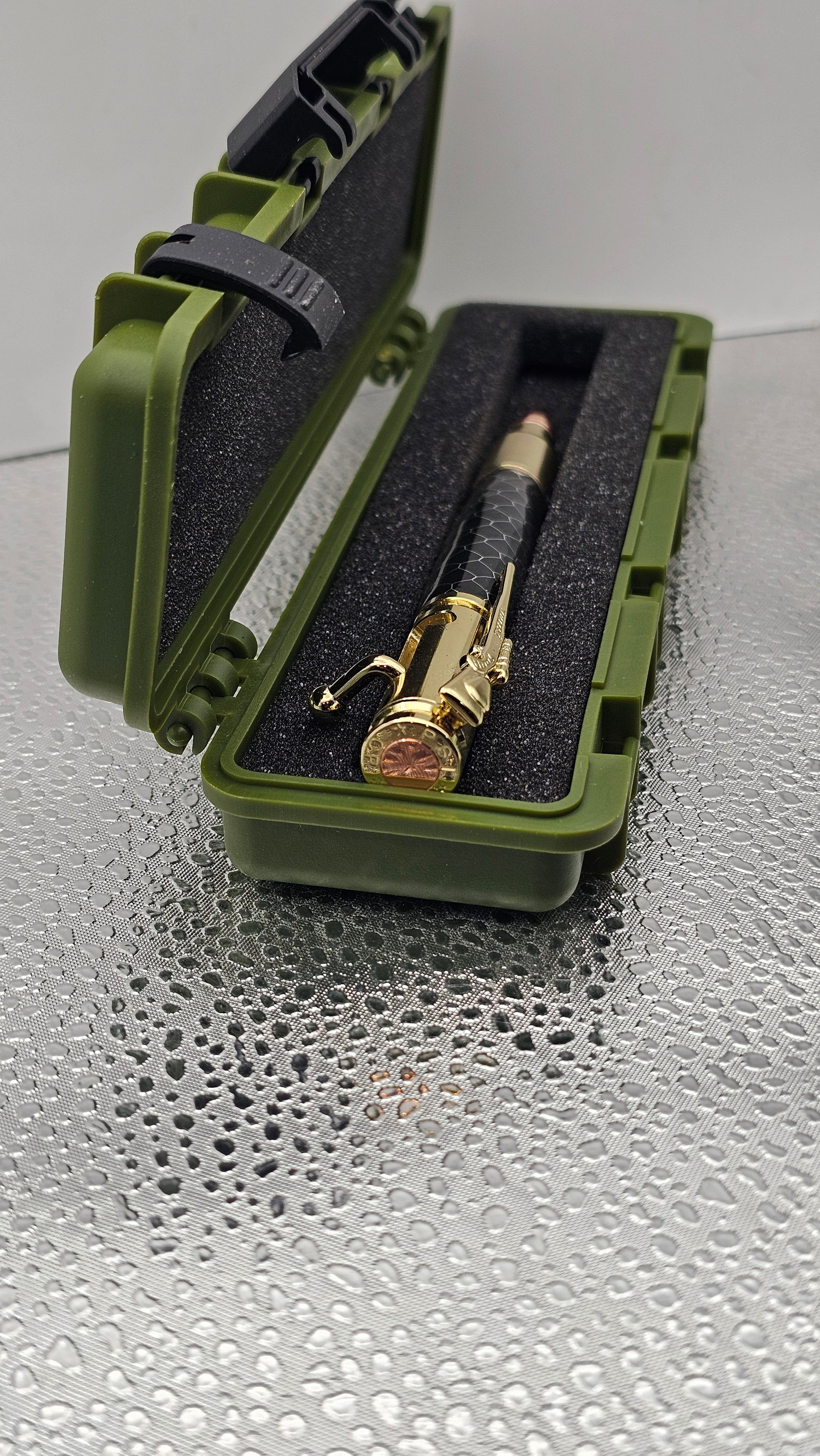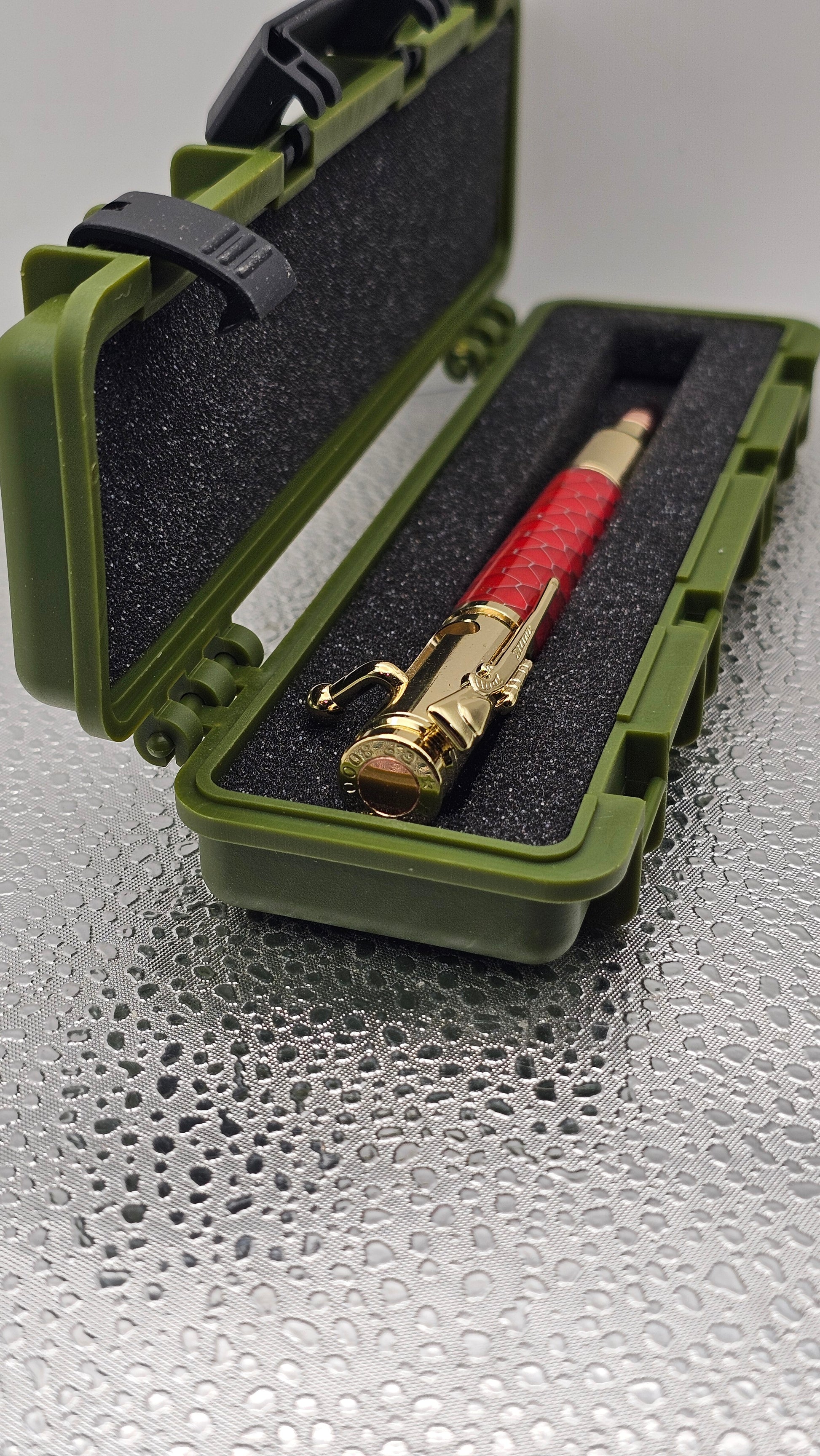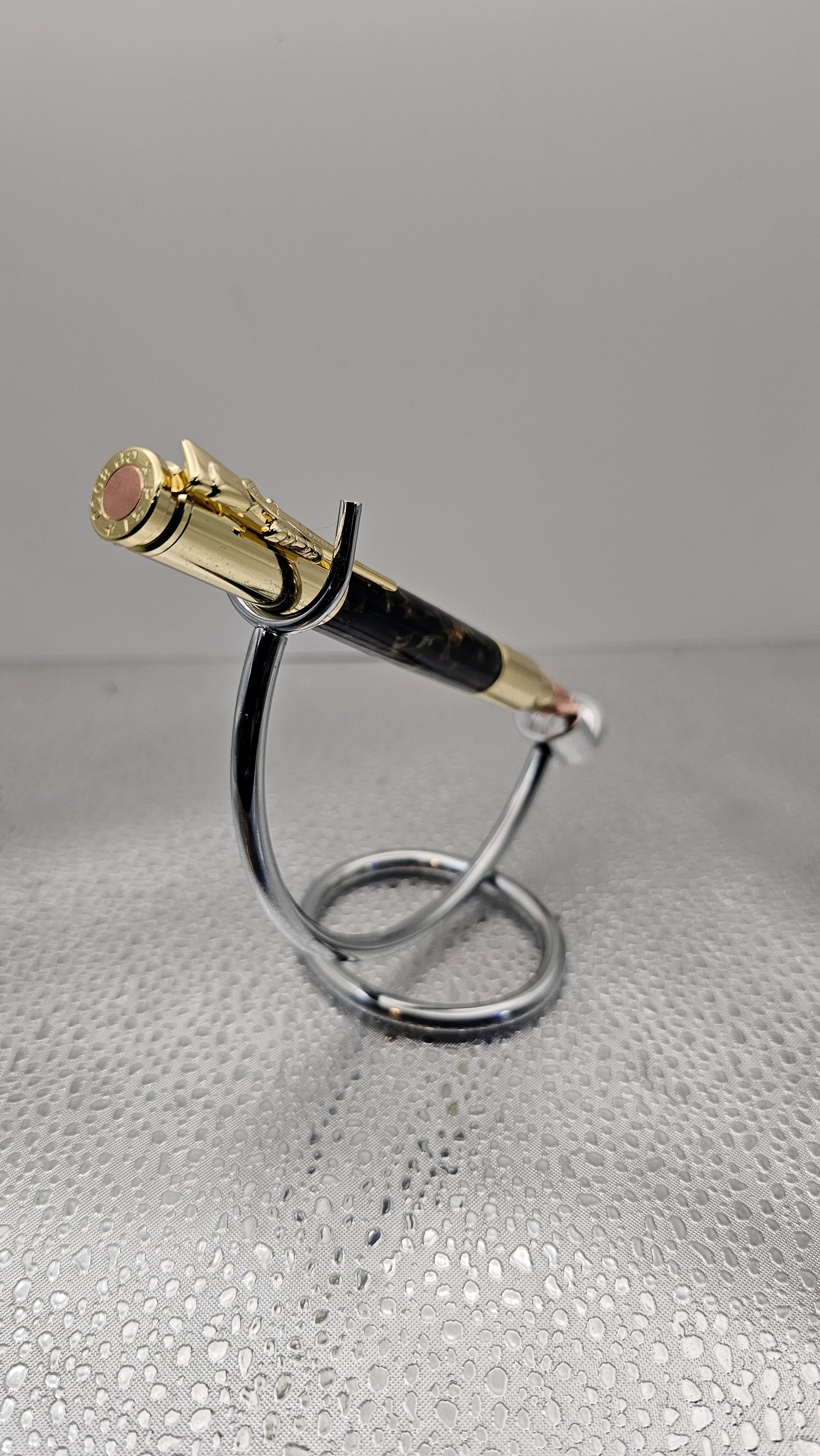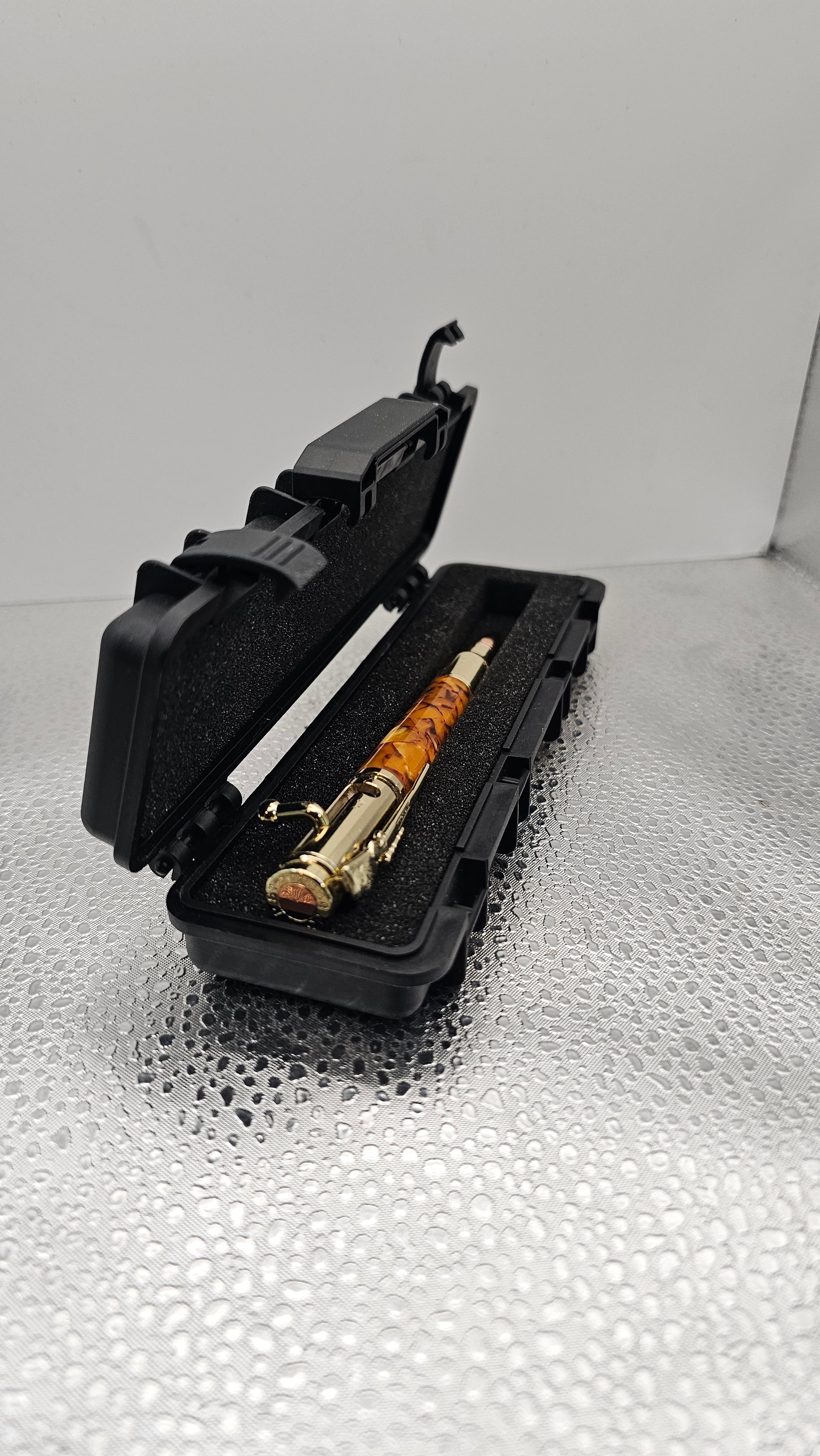 24k Gold 30 Cal Bolt-action hardware, with a hand turned acrylic. The pen comes with its own pen case shaped like a real gun case to compliment the pens style. Some pens have Acrylic, Aluminum Honeycomb, Hybridz, Stabilized Wood, or even Tru Stone.