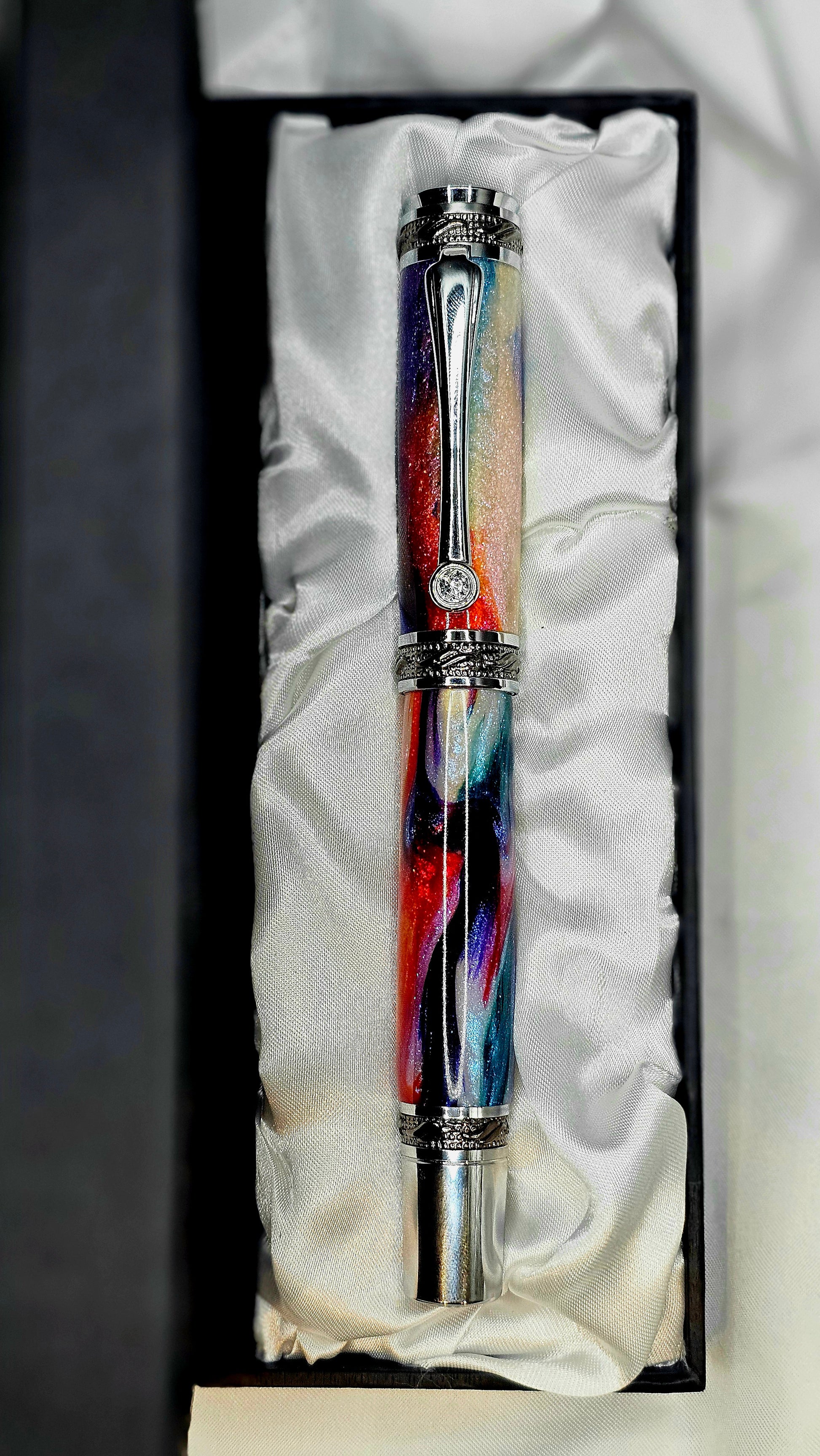 Crafted by Blades and Bands, Celestial Ember is a one-of-a-kind fountain pen that channels the energy of fire and stardust into every stroke. Featuring majestic hardware and a body made from hand-poured resin, its swirling reds, blues, blacks, and silvers evoke the beauty of a cosmic blaze.