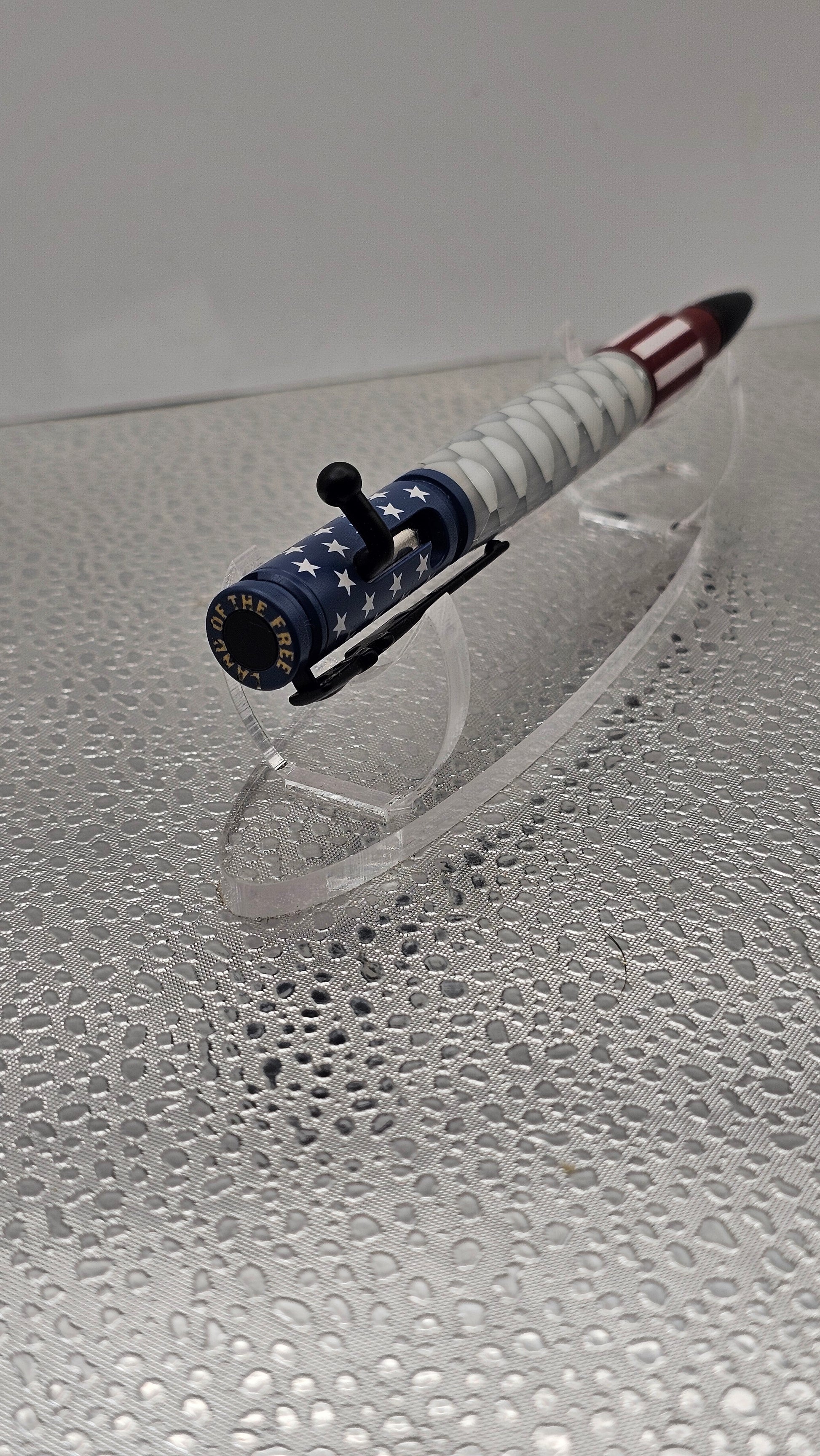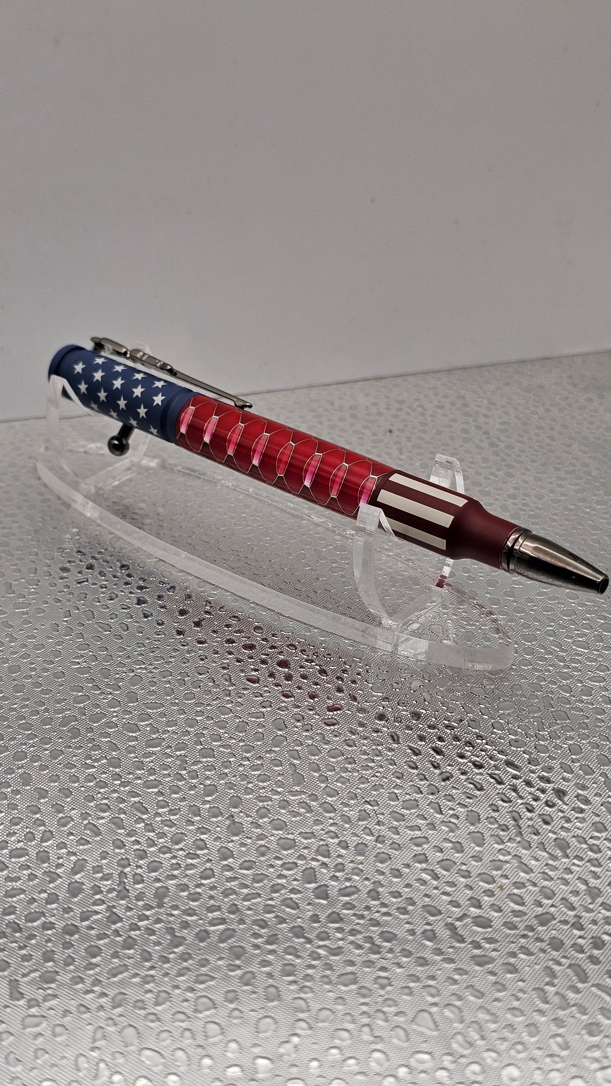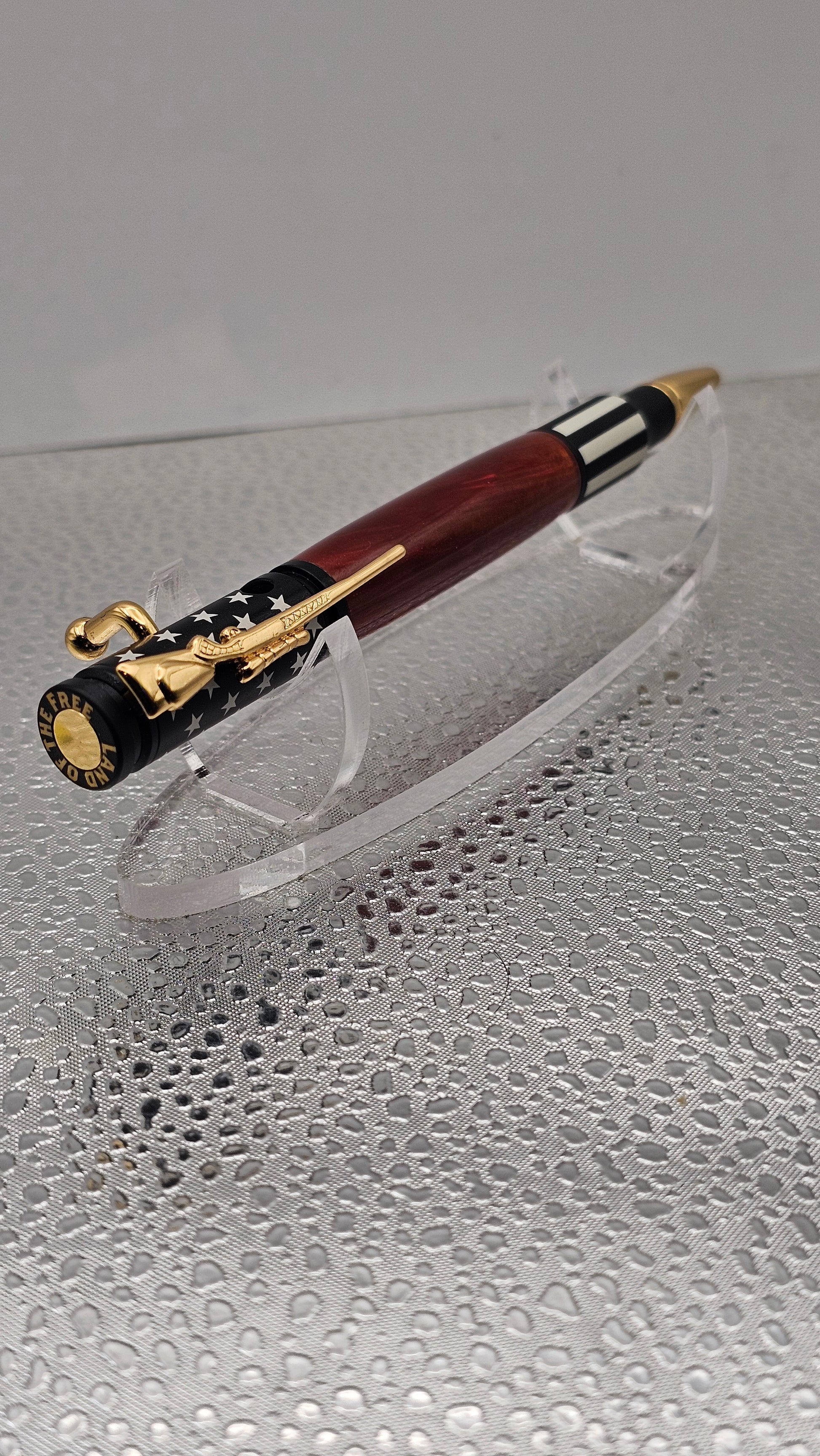 Ceramic 30 Cal Bolt-action hardware, with a hand turned inlay. The pen comes with its own pen case shaped like a real gun case to compliment the pens style. Some pens have Acrylic, Aluminum Honeycomb, Hybridz, Stabilized Wood, or even Tru Stone.