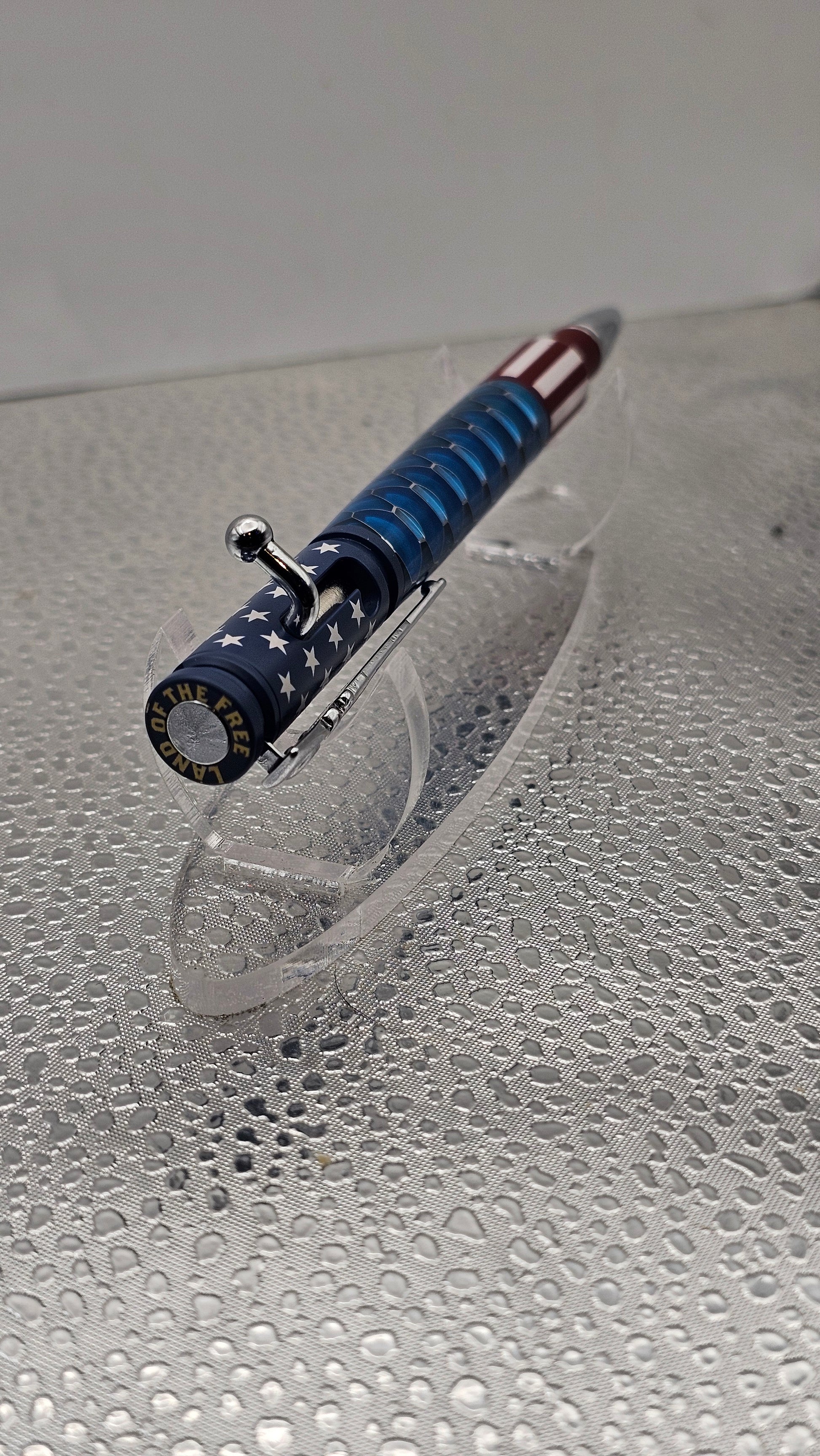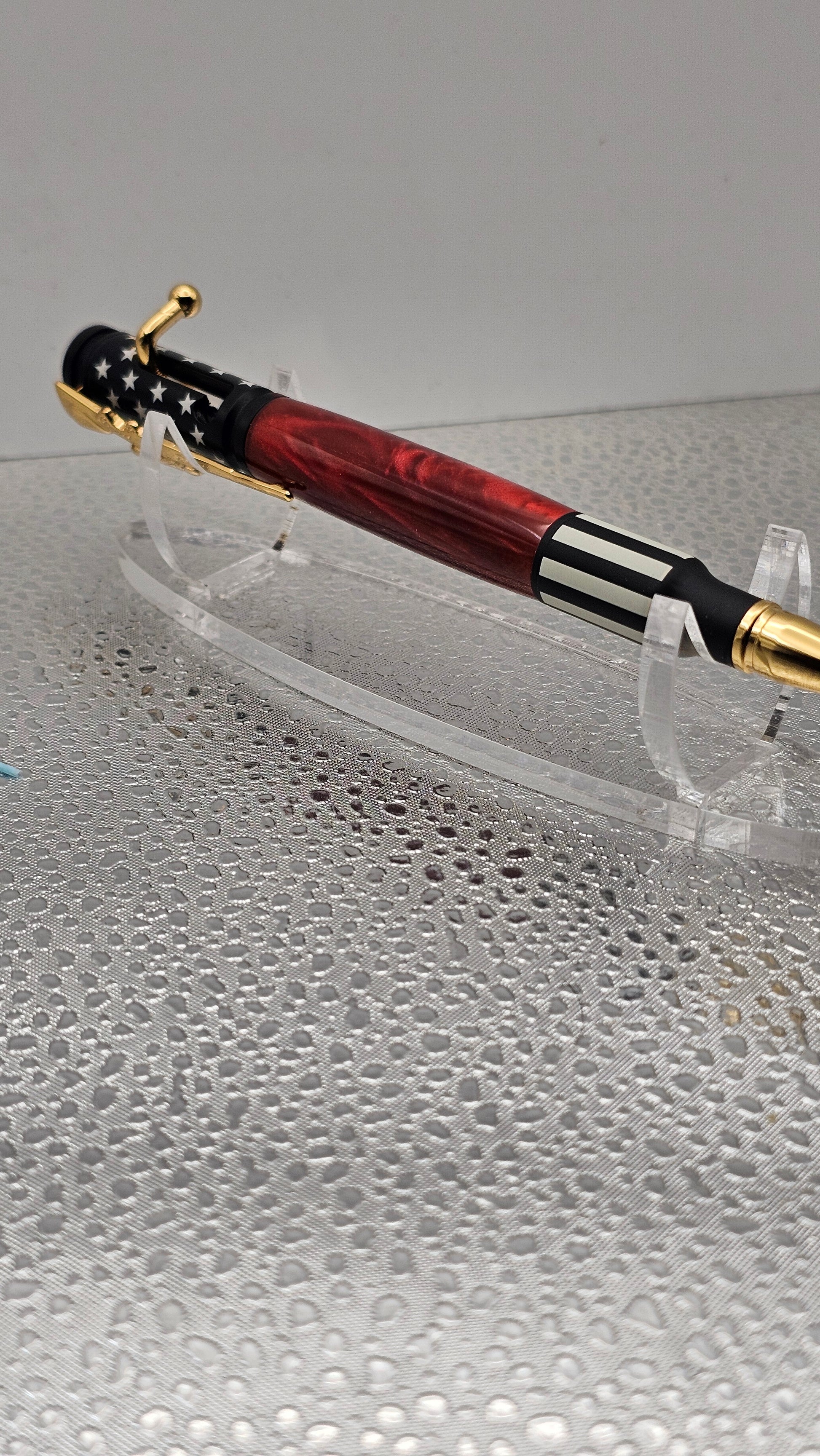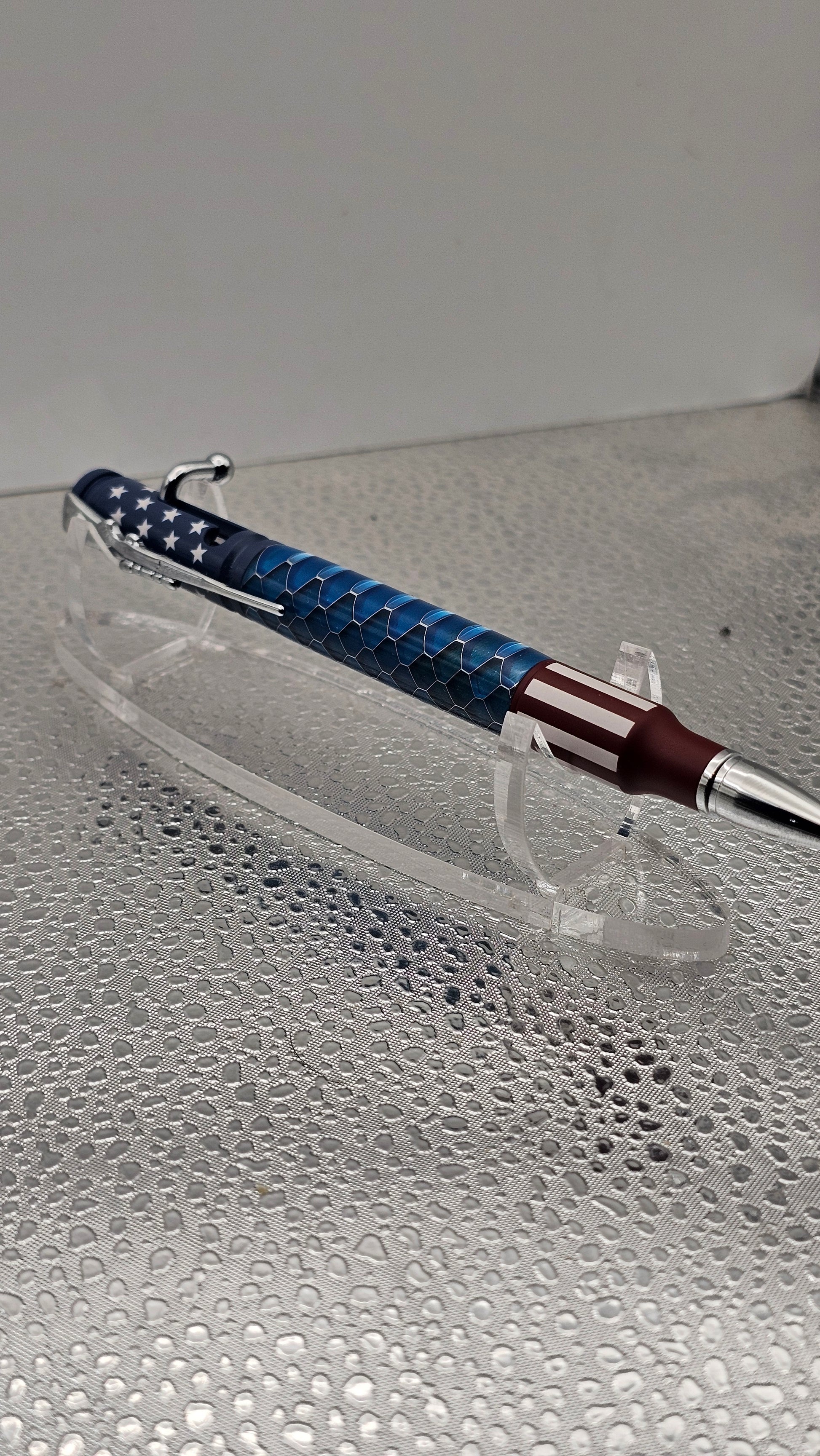 Ceramic 30 Cal Bolt-action hardware, with a hand turned inlay. The pen comes with its own pen case shaped like a real gun case to compliment the pens style. Some pens have Acrylic, Aluminum Honeycomb, Hybridz, Stabilized Wood, or even Tru Stone.