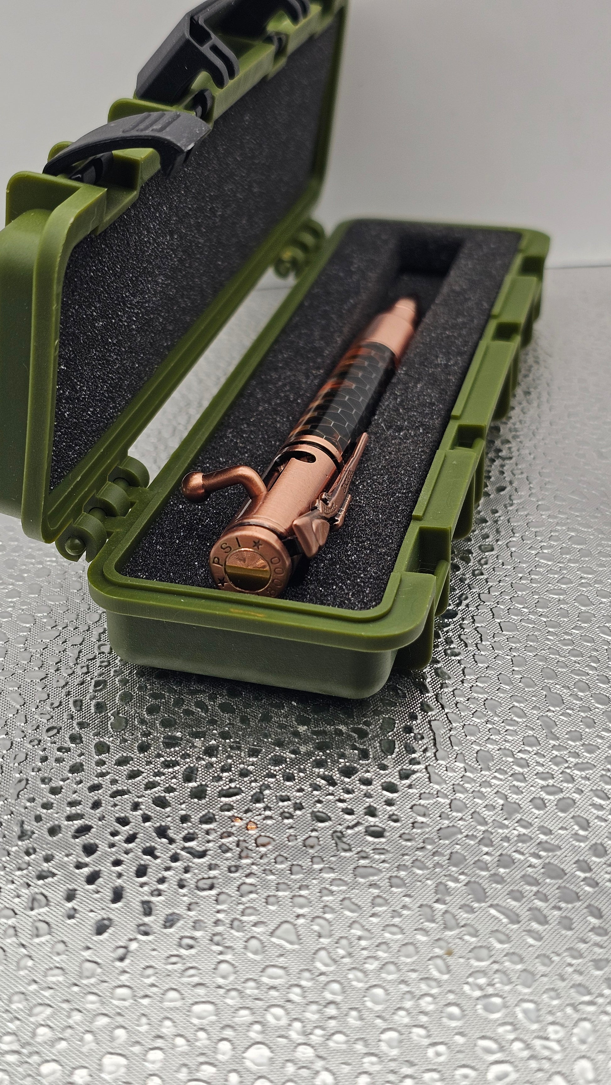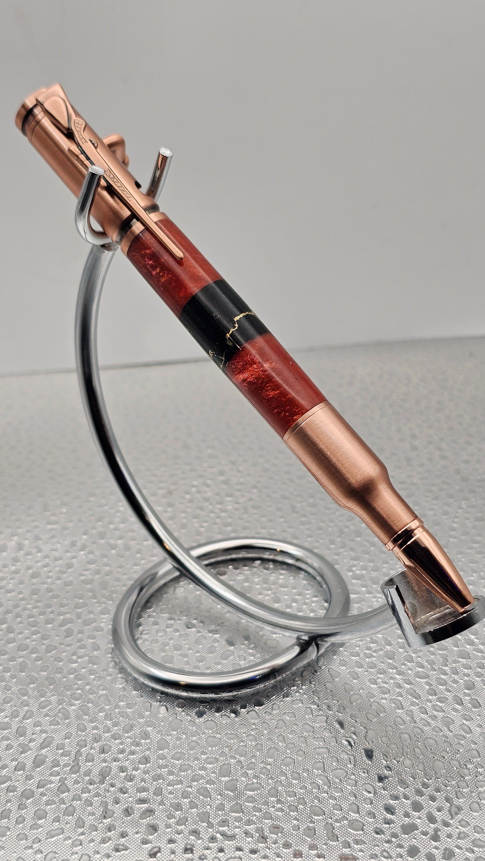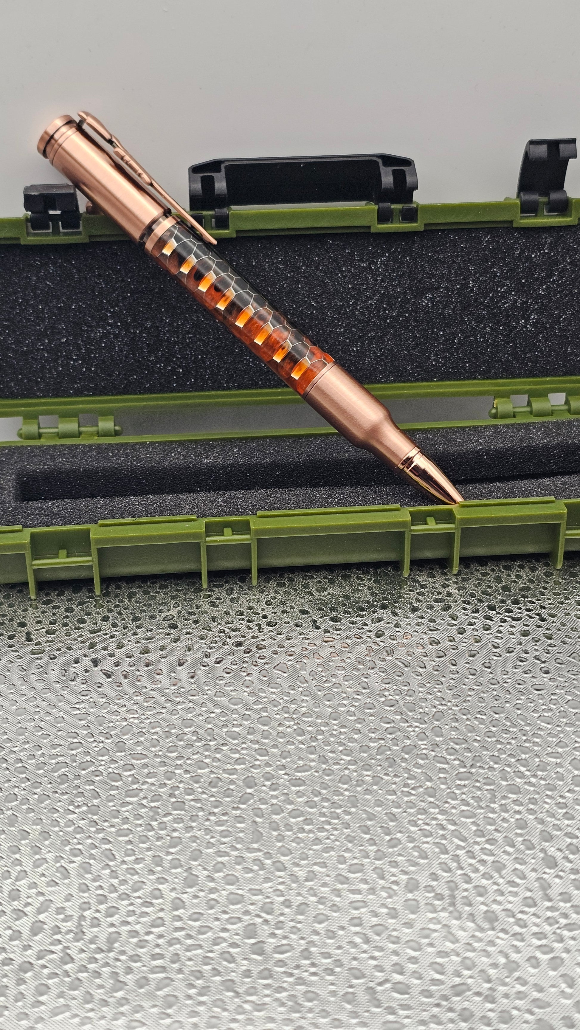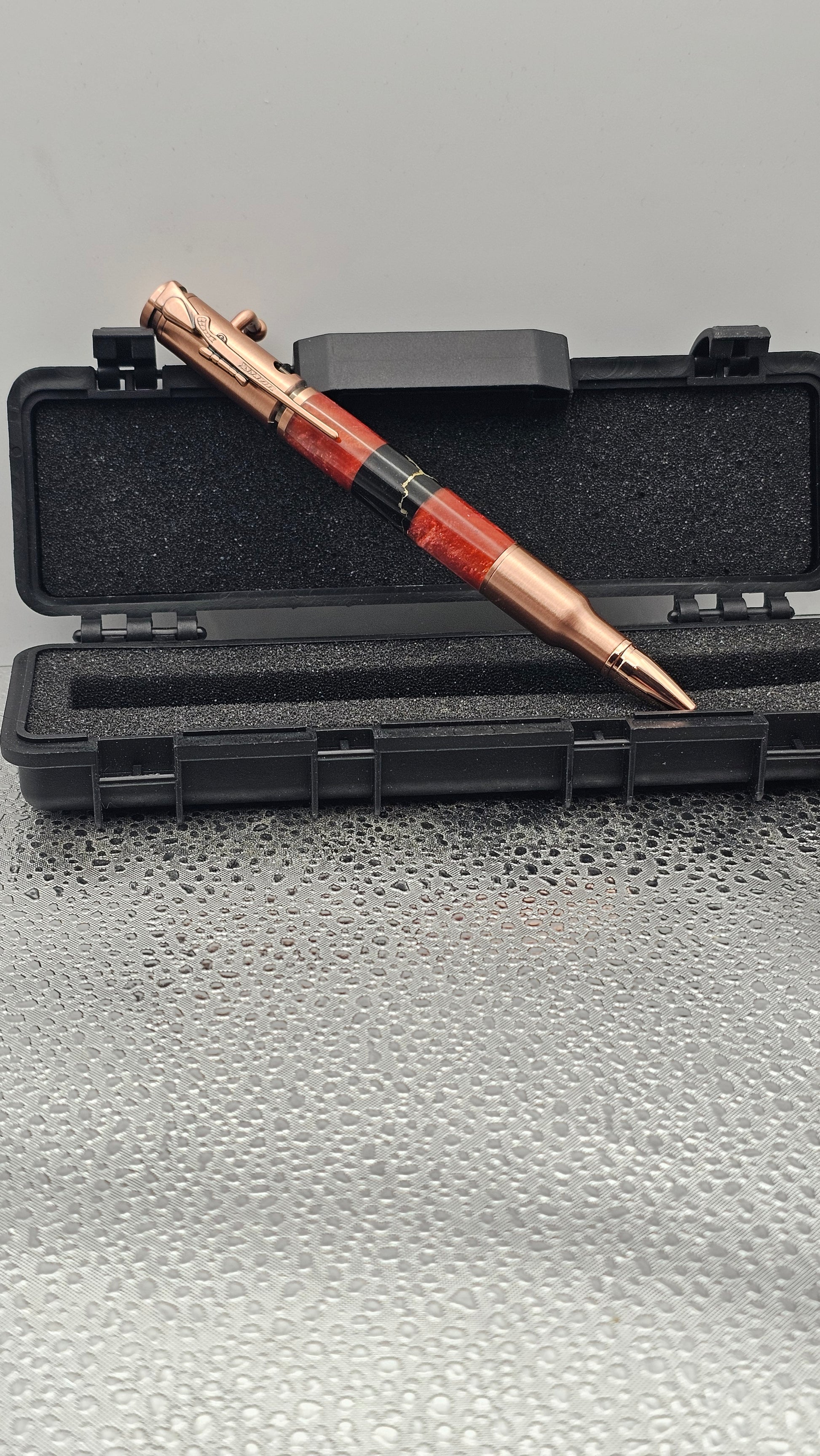 Copper 30 Cal Bolt-action hardware, with a hand turned inlay. The pen comes with its own pen case shaped like a real gun case to compliment the pens style. Some pens have Acrylic, Aluminum Honeycomb, Hybridz, Stabilized Wood, or even Tru Stone.