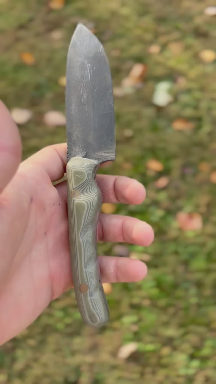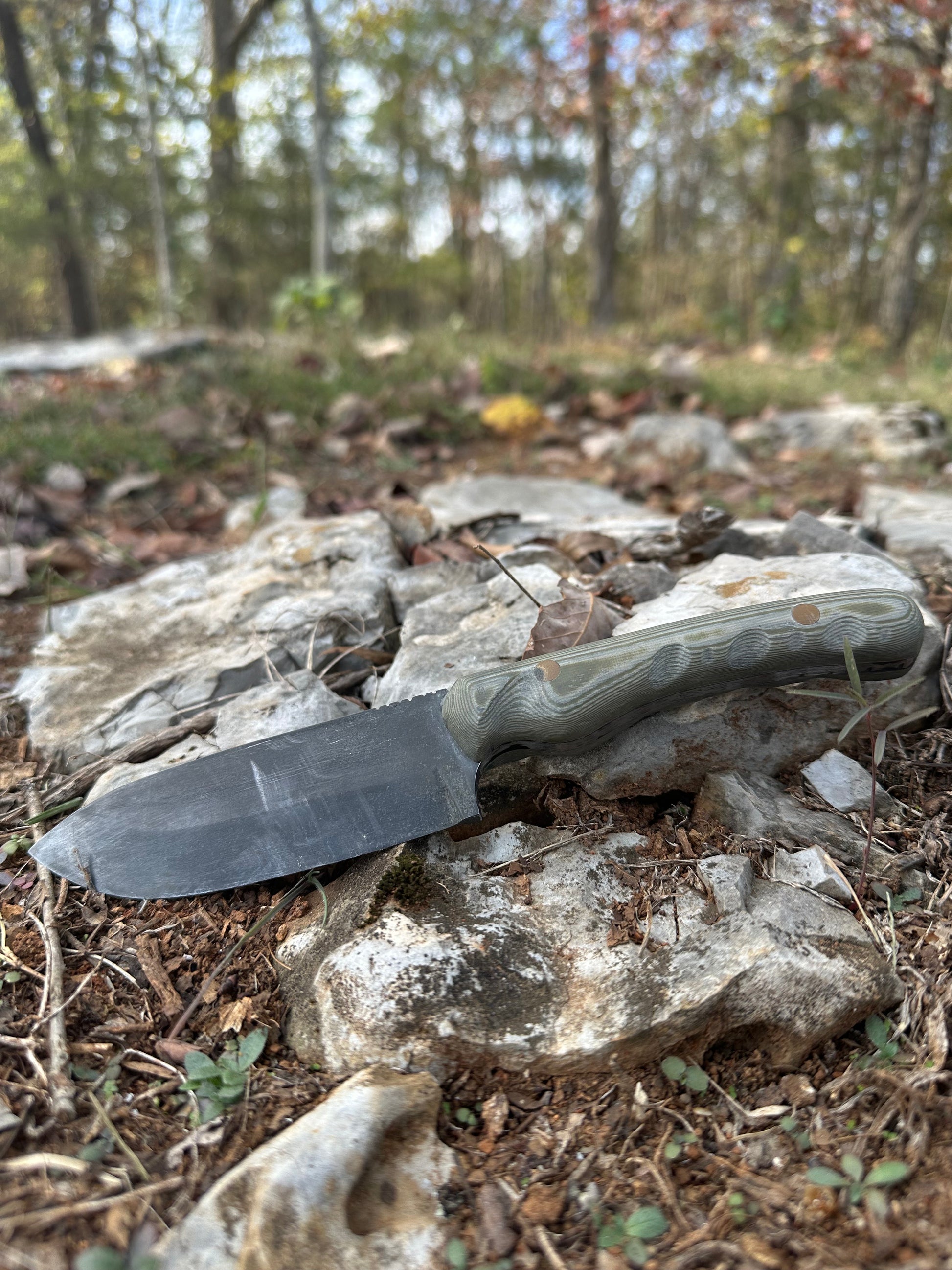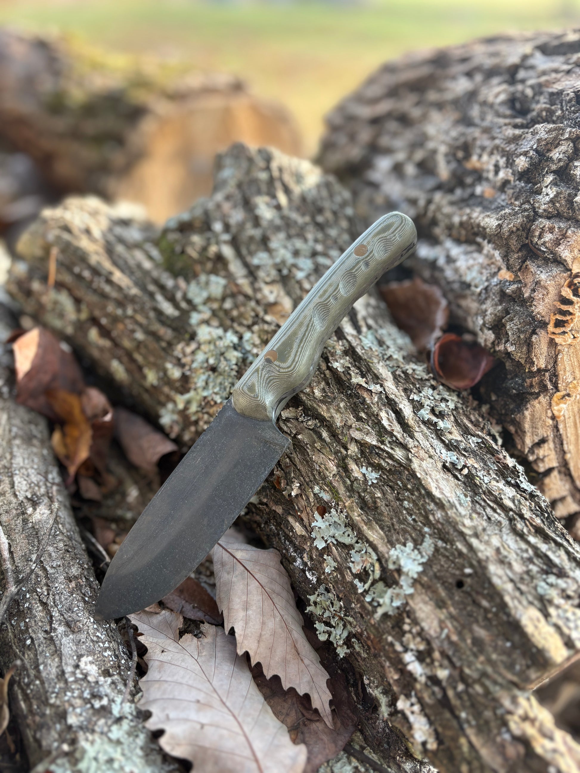 This handcrafted knife features durable OD green G10 scales for a secure, ergonomic grip in any environment. The blade showcases an acid-etched black finish, adding both style and protection against wear and corrosion. Built for reliability and performance, this knife is perfect for outdoor adventures, hunting, or everyday tasks.