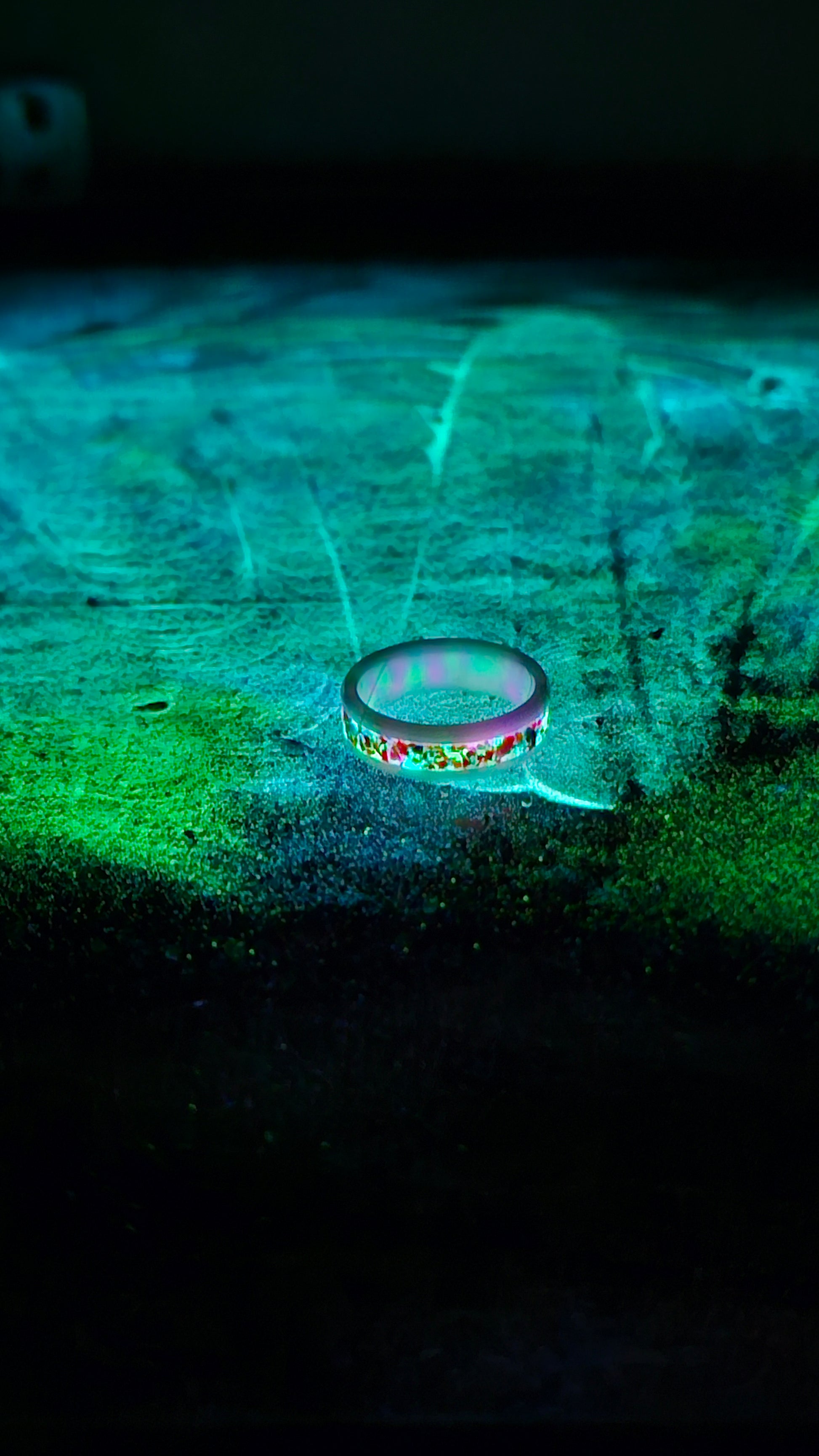 *This Hand-Crafted ring features a vibrant glow stone inlay sourced directly from Patrick Adair Supplies - the same premium materials used in Patrick Adairs Designs. Set in a durable metal band and finished with a high-gloss polish, each ring glows brilliantly in low light and sparkless with embedded opals, and/or exotic martials. Weather you're a collector, a fan of artisan jewelry, or just looking for a unique gift With high-end style.