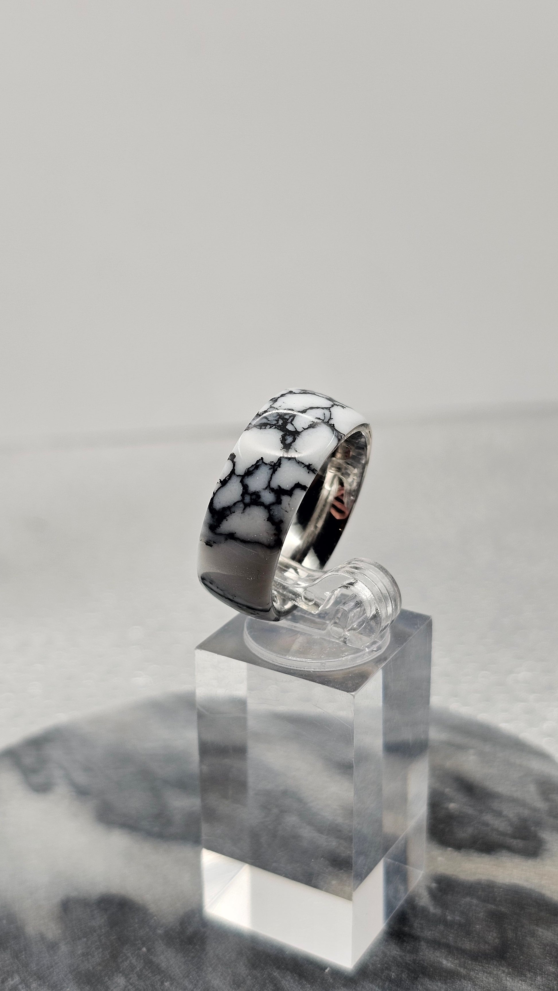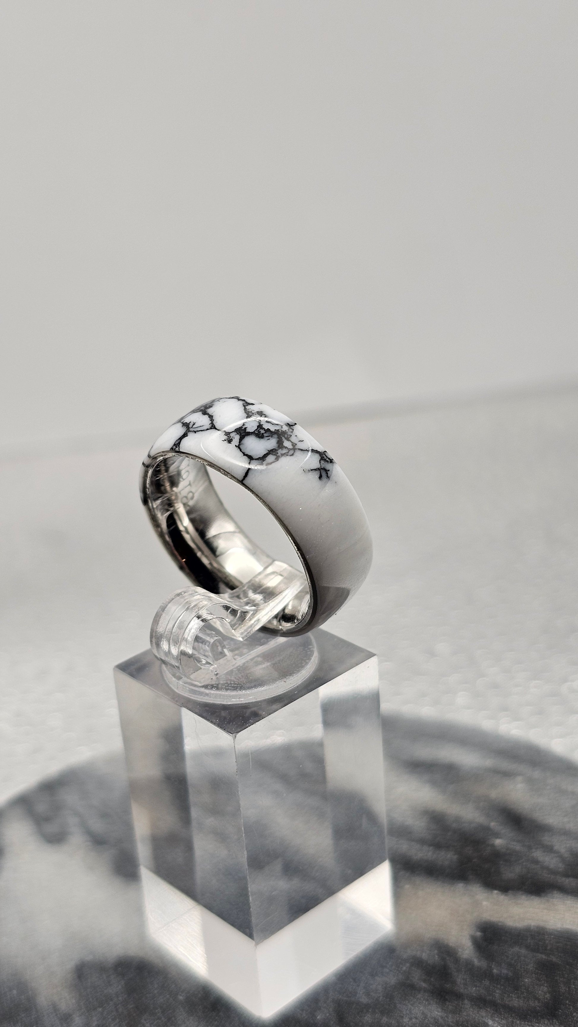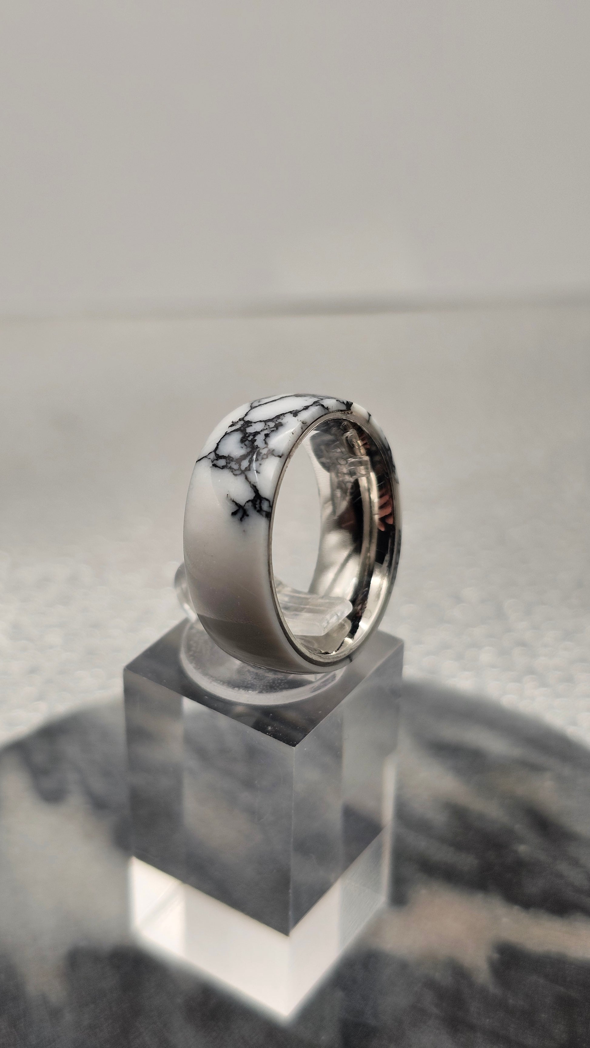 A fusion of raw sophistication and elemental grit, this ring pairs a resilient stainless steel base with a striking white stone inlay, laced with a bold black matrix. The surface mimics fractured earth or forged marble—each pattern echoing nature’s artistry in a piece built for permanence.